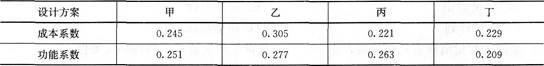 解析 考点: “价值工程原理”。价值系数=功能系数/成本系数,价值系数最高的为最优方案。本题中,甲的价值系数=0.25l/0.245=1.024;乙的价值系数=0.277/0.305 =0. 908;丙的价值系数=0.263/0.221 =l.190;丁的价值系数=0.209/0.229=0.913。四个分部工程中,丙的价值系数最大,所以,丙为最佳方案。因此,本题的正确答案为C。
