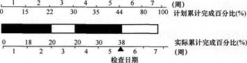 解析 考点: “横道图比较法”。当工作在不同单住时间里的进展速度不相等时,累计完成的任务量与时间的关系就不可能是线性关系。此时,应采用非自速进展横道图比较法进行工作实际进度与计划进度的比较。本题为非匀速进展横道图比较法的图。从图中可以看出第3周末涂黑粗线,表明第3周内中断施工。所以,选项B的叙述是正确的。第5周末计划完成44%,实际完成38%.拖后6%。所以,选项D的叙述是不正确的。第1周实际进度提前3%,第4周拖后5%。所以,选项A、C的叙述均是不正确的。第3周内计划完成8%。所以,选项E的叙述是正确的。因此,本题的正确答案为CBE。