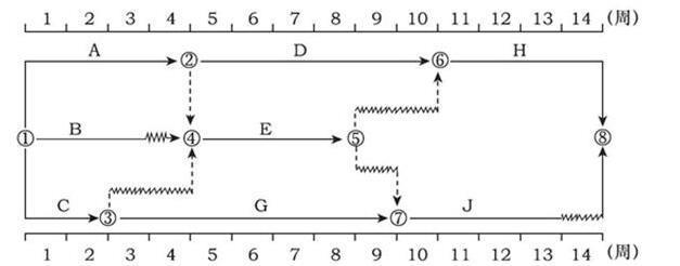 解析 本题考查的是时标网络计划中时间参数的判定。如果按原计划实行,施工机械闲置时间总共为4周。通过时间参数的计算,工作C的总时差为1周、自由时差为0周,工作E的总时差为2周,工作H的总时差为0周、自由时差为0周。三项工作共用一台机械且必须顺序施工,关键线路为A→D→H,对于工作H不可以提前开始也不可以推迟开始。对于工作C只可以晚开始1周,也就是在第2周开始工作,才不会影响其后工作G、J的完成。这样施工机械在现场最小闲置时间为4-1=3周。参见教材P63。