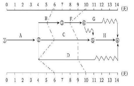 问题 某分部工程双代号时标网络计划执行到第6天和第10天结束时,检查其实际进度如下图前锋线所示,检查结果表明( )。
