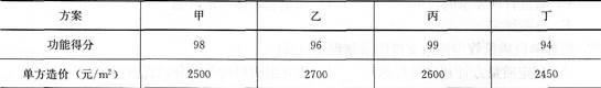 问题 某项目,有甲、乙、丙、丁4个设计方案,通过专业人员测算和分析,4个方案功能得分和单方造价见下表。按照价值工程原理,应选择实施的方案是(??)。