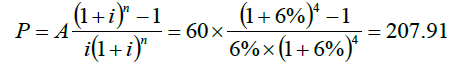 问题 某公司拟投资一项目,希望在4 年内(含建设期)收回全部贷款的本金与利息。预计项目从第1 年开始每年末能获得60 万元,银行贷款年利率为6%。则项目总投资的现值应控制在()万元以下。