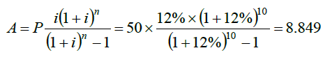问题 某企业用50 万元购置一台设备,欲在10 年内将该投资的复本利和全部回收,基准收益率为12%,则每年均等的净收益至少应为()万元。