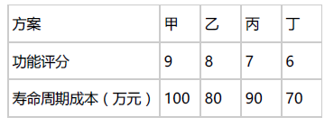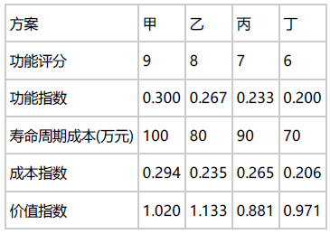 现有四个施工方案可供选择,其功能评分和寿命周期成本相关数据见下表,则根据价值工程原理应选择的最佳方案是(  )。 A.甲 B.乙 C.丙 D.丁