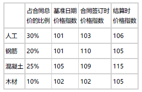 某工程随工合同约定根据价格调整公式调整合同价,已知不调值部分占合同价的比例为15%,可参与调值部分的费用类型、占合同总价的比例和相关价格指数见下表,若结算...