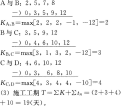 解析 2021/2020教材P32-34 本题考查的是流水施工工期的确定。 (1)求各施工过程流水节拍的累加数列: 施工过程A:2,5,7,8 施工过程B:3,5,9,12 施工过程C:4,6,10,12 施工过程D:3,6,8,10 (2)错位相减求得流水步距: