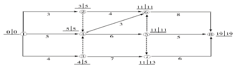 解析 选项A 错。4-(0+4)=0; 选项B 对。关键节点的最早时间=最迟时间,即5=5,11=11;且5+6=11。 选项C 错。如上述理由,工作4-6 不是关键工作。5+3≠11 选项D 错。工作5-8 的总时差=19-(11+5)=3 选项E 对。工作7-8 的自由时差=19-(11+6)=2