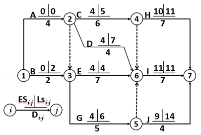 问题 某工程双代号网络计划如下图,已标出各项工作的最早开始时间(ESi-j)、最迟开始时间(LSi-j)和持续时间(Di-j)。该网络计划表明( )。
