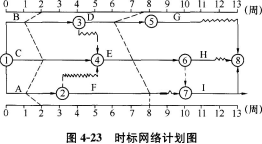 问题 某分部工程双代号时标网络计划执行到第2周末及第8周末时,检查实际进度后绘制的前锋线如图4-23所示,图中表明()。