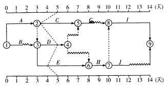 问题 某分部工程时标网络计划如图4-27所示。当该计划执行到第5天结束时检查实际进展情况,实际进度前锋线表明()。