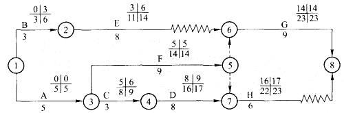 解析 分析 (1)该施工网络计划的关键路线是①→③→⑤→⑥→⑧,关键工作为A、F、G。该施工网络计划的计算工期为23周。 (2)各工序最早可能开始时间、最迟开始时间、最早可能结束时间和最迟完成时间: 工作A:总时差=0,自由时差=0; 工作B:总时差=3,自由时差=0; 工作C:总时差=1,自由时差=0。 (3)可采用以下两种方法进行调整: 1)通过增加作业人员,延长工作时间,采用新工艺等方法来缩短关键路线上的工序作业时间,以达到缩短工期的目的。 2)增加作业、调整工序之间的逻辑关系,来达到缩短工期的目的。