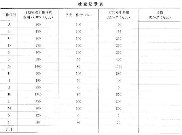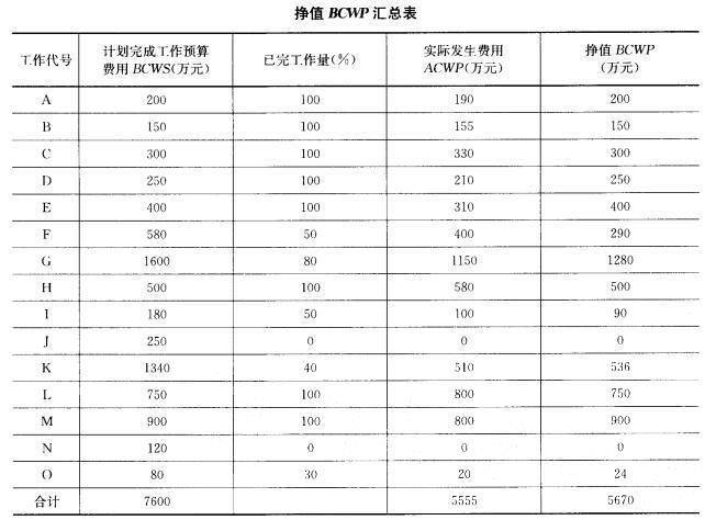 解析 分析 (1)第24周末每项工作的挣值BCWP及汇总如下表所示。 (2)由表可知,24周末已完成工作实际费用ACWP为5555万元,计划完成工作预算费用BCWS为7600万元,BCWP为5670万元。 (3)CV= BCWP-ACWP =5670-5555 = 115>0,说明运行节支,实际费用在预算范围内。 SV= BCWP-BCWS= 5670 -7600= -1930(4)CPI=BCWP/ACMP=5670/5555 =1. 02>1,表示节支,即实际费用低于预算费用。 SPI=BCWP/BCWS = 5670/7600 = 0. 75解析 本题主要考核挣值法的应用,针对计算结果要求应试人员能够进行分析,下列考点应该熟练掌握: (1)挣值法的三个基本参数 1)已完工作预算费用 已完工作预算费用为BCWP(Budgeted Costfor Work Performed),是指在某一时间已经完成的工作(或部分工作),以批准认可的预算为标准所需要的资金总额,由于业主正是根据这个值为承包人完成的工作量支付相应的费用,也就是承包人获得(挣得)的金额,故称赢得值或挣值。 已完工作预算费用(BCWP) =已完成工作量X预算单价 2)计划工作预算费用 计划工作预算费用,简称BCWS(Budgeted Costfor Work Scheduled),即根据进度计划,在某一时刻应当完成的工作(或部分工作),以预算为标准所需要的资金总额,一般来说,除非合同有变更,BCWS在工程实施过程中应保持不变。 计划工作预算费用(BCWS)=计划工作量X预算单价 3)已完工作实际费用 已完工作实际费用,简称ACWP( Actual Cost for Work Performed),即到某一时刻为止,已完成的工作(或部分工作)所实际花费的总金额。 已完工作实际费用(ACWP)=已完成工作量X实际单价 (2)挣值法的四个评价指标 在这三个基本参数的基础上,可以确定挣值法的四个评价指标,它们也都是时间的函数。 1)费用偏差 CV(Cost Variance) 费用偏差(CV)=已完工作预算费用(BCWP)-已完工作实际费用(ACWP) 当费用偏差(CV)为负值时,即表示项目运行超出预算费用;当费用偏差(CV)为正值时,表示项目运行节支,实际费用没有超出预算费用。 2)进度偏差 SV(Schedule Variance) 进度偏差(SV)=已完工作预算费用(BCWP)-计划工作预算费用(BCWS) 当进度偏差(SV)为负值时,表示进度延误,即实际进度落后于计划进度;当进度偏差(SV)为正值时,表示进度提前,即实际进度快于计划进度。 3)费用绩效指数(CPI) 费用绩效指数(CPI) =已完工作预算费用(BCWP)/已完工作实际费用(ACWP) 当费用绩效指数CPI<1时,表示超支,即实际费用高于预算费用; 当费用绩效指数CPI>1时,表示节支,即实际费用低于预算费用。 4)进度绩效指数(SPI) 进度绩效指数(SPI)=已完工作预算费用(BCWP)/计划工作预算费用(BCWS) 当进度绩效指数SPI当进度绩效指数SPI>1时,表示进度提前,即实际进度比计划进度快。