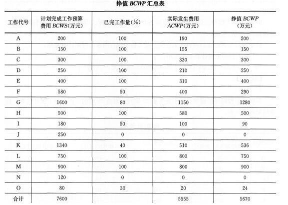 解析 分析与答案 (1)第24周末每项工作的挣值BCWrP及汇总如下表所示。 (2)由表可知,24周末已完成工作实际费用ACWP为5555万元,计划完成工作预算费用BCWS为7600万元,BCWP为5670万元。 (3)CV=BCWP-ACWP=5670-5555-115>0,说明运行节支,实际费用在预算范围内。 SV=BCWP-BCWS=5670-7600=-1930<0,说明进度延误,实际进度落后于计划进度。 (4)CPI=BCWP/ACWP=5670/5555=1.02>1,表示节支,即实际费用低于预算费用。 SPI=BCWP/BCWS=5670/7600=0.75<1,表示进度延误,即实际进度比计划进度拖后。 4.解析 本题主要考核挣值法的应用,针对计算结果要求应试人员能够进行分析,下列考点应该熟练掌握: (1)挣值法的三个基本参数 1)已完工作预算费用 已完工作预算费用为BCWP(Budgeted Costfor Work Performed),是指在某一时间已经完成的工作(或部分工作),以批准认可的预算为标准所需要的资金总额,由于业主正是根据这个值为承包人完成的工作量支付相应的费用,也就是承包人获得(挣得)的金额,故称赢得值或挣值。 已完工作预算费用(BCWP)=已完成工作量×预算单价 2)计划工作预算费用 计划工作预算费用,简称BCWS(Budgeted Costfor Work Scheduled),即根据进度计划,在某一时刻应当完成的工作(或部分工作),以预算为标准所需要的资金总额,一般来说,除非合同有变更,BCWS在工程实施过程中应保持不变。 计划工作预算费用(BCWS)=计划工作量×预算单价 3)已完工作实际费用 已完工作实际费用,简称ACWP(Actual Cost for Work Performed),即到某一时刻为止,已完成的工作(或部分工作)所实际花费的总金额。 已完工作实际费用(ACWP)一已完成工作量×实际单价 (2)挣值法的四个评价指标 在这三个基本参数的基础上,可以确定挣值法的四个评价指标,它们也都是时间的函数。 1)费用偏差CV(Cost Variance) 费用偏差(CV)=已完工作预算费用(BCWP)已完工作实际费用(ACWP) 当费用偏差(CV)为负值时,即表示项目运行超出预算费用;当费用偏差(CV)为正值时,表示项目运行节支,实际费用没有超出预算费用。 2)进度偏差SV(Schedu1e Variance) 进度偏差(SV)=已完工作预算费用(BCWP)-计划工作预算费用(BCWS) 当进度偏差(SV)为负值时,表示进度延误,即实际进度落后于计划进度;当进度偏差(SV)为正值时,表示进度提前,即实际进度快于计划进度。 3)费用绩效指数(CPI) 费用绩效指数(CPI)一已完工作预算费用(BCWP)/已完工作实际费用(ACWP) 当费用绩效指数CPI<1时,表示超支,即实际费用高于预算费用; 当费用绩效指数CPI>1时,表示节支,即实际费用低于预算费用。 4)进度绩效指数(SPI) 进度绩效指数(SPI)=已完工作预算费用(BCWP)/计划工作预算费用(BCWS) 当进度绩效指数SPI<1时,表示进度延误,即实际进度比计划进度拖后; 当进度绩效指数SPI>1时,表示进度提前,即实际进度比计划进度快。