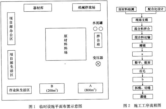 某施工单位承建机场水泥混凝土道面工程。施工单位进场后,依据建设单位提供的临时用地实际情况,编制了临时设施平面布置示意图(如图1所示)和水泥混凝土面层施工工...