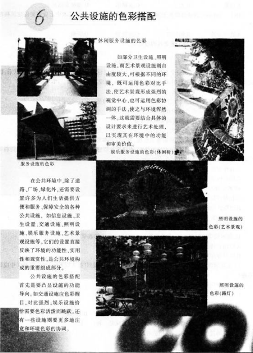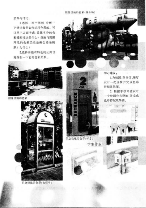 解析 【课题】公共设施的色彩搭配 【教学目标】 知识与技能:明确公共设施色彩搭配的重要性,理解公共设施的色彩与周围环境的关系,能够为公共设施搭配色彩。 过程与方法:讨论公共设施的色彩搭配,并对自己的作品进行恰当的搭配。 情感、态度与价值观:了解设计与生活的关系,增强对生活的热爱之情,形成爱护公共设施的意识。 【教学重点】公共设施的色彩搭配的功能性、实用性与观赏性。 【教学难点】选择怎样的色彩关系,才能创造出符合特定目的、要求,具有一定艺术情调的色彩设计。 【教学方法】欣赏法、分析法、讨论法。 【教学准备】 教具准备:多媒体课件。 学具准备:彩铅、速写纸、橡皮、签字笔等。 【教学过程】 一、组织教学,导入新课 温故知新导入新课:教师引导学生回顾上节课学习的公共设施设计中。公共设施分为哪几类 同学回答:分为卫生设施、信息设施、交通设施、照明设施、娱乐服务设施、艺术景观设施等。 教师总结补充,引出《公共设施的色彩搭配》这一课题。 二、合作探究,新课讲授 1,教师提示学生留意观察生活中常用的公共设施,并提问: 你认为哪些公共设施对你来说很重要 学生思考回答问题:公交车站、公用电话、路灯、垃圾箱、座椅等。 2,教师追问: 这些与生活息息相关的公共设施在色彩方面有什么样的要求呢 这些色彩用在公共设施上给人们又带来了什么样的感受呢 组织学生分组讨论问题,并由小组代表发表见解,教师总结评价。 (设计意图:通过提问引导学生思考生活周围公共设施的色彩搭配,了解设计与生活的关系,形成爱护公共设施的意识) 三、巩固提高,拓展延伸 1,教师出示公共设施的系列图片,并提问: 公共设施的色彩搭配需要注意哪些问题 学生继续讨论并回答问题: ①强化公共设施的功能; ②考虑公共设施的色彩与周围的关系; ③材料在色彩效果中扮演着重要角色。 2,教师播放课件出示本课作业:根据本课所学色彩搭配知识,为校园、图书馆、或餐厅设计一把座椅并完成色彩搭配效果图。 学生独立构思并设计草图,教师巡视指导。 3,师生共同进行学生作品的展评,挑选出1~2幅较为优秀的作品从构图以及色彩搭配的合理性方面进行分析。学生根据老师提出的要求进行自评和互评。 (设计意图:引导学生总结色彩搭配需注意的问题,并鼓励学生大胆创作,解决教学重、难点) 四、课堂小结,布置作业 1,教师鼓励学生进行本课重点的总结与回顾。 2,课下尝试根据本课所学为学校设计一个校园公共设施,并完成色彩搭配效果图。 (设计意图:鼓励学生大胆创作,巩固课程内容)