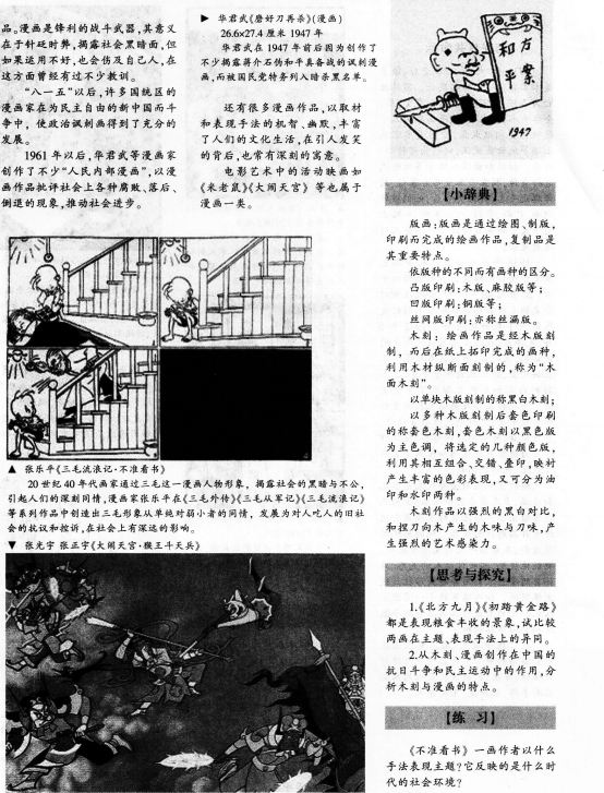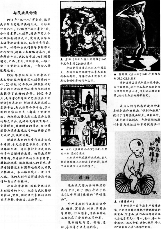 解析 【课题】与民族共命运——木刻与漫画 【课型】新授课 【课时】1课时 【教学目标】 知识与技能:了解木刻既有传统渊源又是新兴的美术门类的特点和发展脉络。 过程与方法:学生认识美术的社会作用,体会文艺家对国家民族的使命感。 情感、态度和价值观:提高对美术学科的学习兴趣,体验木刻与漫画的神奇。 【教学重点】学生了解版画的分类、作用以及深刻的内涵。 【教学难点】理解版画其中蕴含的情感。 【教学过程】 (一)导入 出示徐悲鸿《奔马》、司徒乔《放下你的鞭子》《“七七”的号角》等作品,引导学生讨论分析作品的时代背景和特殊的意义。 指出:在抗日战争和民主革命运动中,美术家与民族共命运,表现了可贵的爱国热情和历史的使命感。但在当时,以画笔为武器,积极投身于抗日救亡和民主革命运动的最多的是木刻家和漫画家。 (设计意图:以多媒体播放革命版画作品导入,激发学生的爱国情感,顺利引入新课) (二)新课 1.提出问题讨论 木刻的特点与制作方法有哪些 漫画有哪些种类与特点 讨论指出:中国20世纪30年代初期出现由鲁迅倡导,以进步美术青年为主力的木刻创作运动。中国古代木刻版画具有悠久的历史,但这种版画都是刻工复刻画师的原稿,是一种复制木刻。这种木刻大约在14世纪初传到欧洲,到19世纪欧洲产生了创作木刻。创作木刻的特点是不模仿、不复制,刻者自己以刀代笔,以木代纸或布,完全由刻者自己创作,刻家就是画家。 2.作品鉴赏 师:你喜欢哪件作品 (请3位同学发言) 作品有什么样的艺术特色 (反映人民疾苦,揭露黑暗的社会现实) 教师小结:木刻在抗日战争和民主革命运动中发挥过巨大战斗作用,美术家与民族共命运。表现了可贵的爱国热情和历史的使命感。 (三)实践 教师展示李桦的《起来,饥寒交迫的奴隶》和古元《乡政府办公室》两幅木刻版画作品,引导学生四人一小组欣赏讨论。教师巡视指导。 (设计意图:学生运用所学知识及时巩固。大胆发表看法) (四)展示 学生选取代表发表看法,同学互评,教师小结。 (设计意图:展示自己,风采飞扬,教师起到良好的引导与总结的作用) (五)课堂小结 教师与学生共同总结:木刻和漫画创作始终坚持现实主义的创作方法,反映人民疾苦,揭露黑暗的社会现实,成为二十世纪三四十年代最活跃和最有战斗性的美术运动之一。 (设计意图:巩固知识,提升学生对版画的喜爱程度) (六)课外延伸 教师提问:漫画的本义是什么 和我们当今喜欢的漫画有什么不同 漫画有哪些著名艺术家 你喜欢谁的哪件作品 下节课老师就听同学们讲一讲。 (设计意图:以设疑的方式,为下节课做好完美铺垫) 【板书设计】() 【教学反思】()