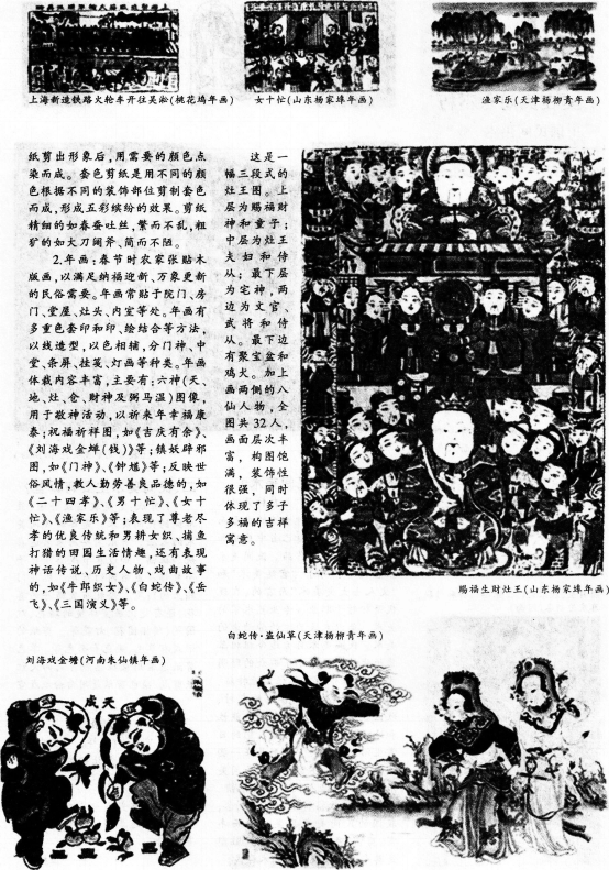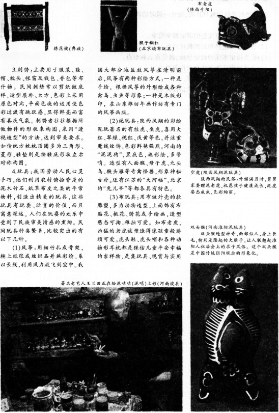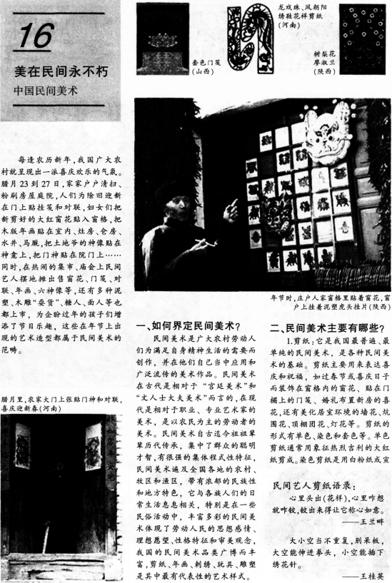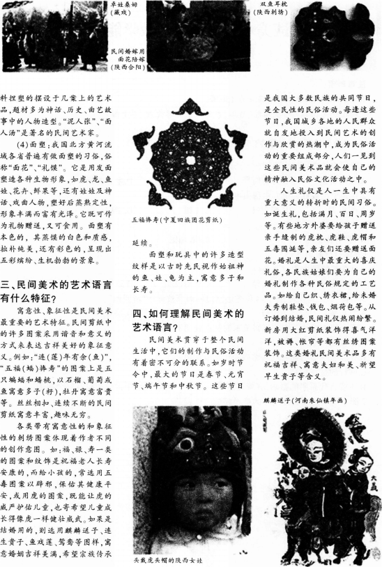 解析 【课题】美在人间永不朽——中国民间美术 【课型】新授课 【课时】1课时 【教学目标】 知识与技能:掌握“民间美术”的概念;理解“民间美术”的艺术特征;了解“民间美术”的形式表现。 过程与方法:学生掌握自主学习、探究学习方法;尝试把“搜集资料一阅读欣赏一讨论探索一评价延伸”的学习方式引入课堂.来培养对中国民间美术作品的初步的欣赏能力。 情感、态度与价值观:喜爱民间美术,理解中华民族文化的博大精深,从而培养热爱本民族文化,包容多元文化的情感。 【教学重点】通过本课学习让学生了解中国民间美术中有代表性的艺术样式;理解民间美术的语言特征;民间美术与民俗的关系。 【教学难点】民间美术的概念讲解与掌握;民间美术特征的理解与掌握。 【教学方法 】讲授法、讨论法、演示法 【教具准备】教师:多媒体课件,学生:搜集资料 【教学过程】 一、创设情境.导入课程 通过播放过年回家的动画视频及春节广告等以剪纸和皮影方式呈现的艺术形式,激发学生兴趣,讲授新课。 1.播放图片幻灯片,如剪纸、刺绣,组织学生分组讨论并提出问题:是否见过这些作品,反映的是什么内容 2.教师作详细讲解。 3.展示实物,总结剪纸、刺绣的特点与分类。 4.提出问题:为什么春节时家家户户都要贴年画 有什么特点 教师解答并讲述。 二、合作探讨,巩固提高 1.播放多媒体板书,板书内容为总结民间美术的分类、特点,采用提纲式板书。 2.播放相关图片资料让学生欣赏,按小组的形式进行讨论与交流。并提出问题:就作品的内容和采用的美术形象而言,民间美术有什么寓意和象征意义 三、教师小结,布置作业 1.教师总结民间美术的艺术特色。 2.布置课后作业:2008年奥运吉祥物的设计与民间美术的关系。