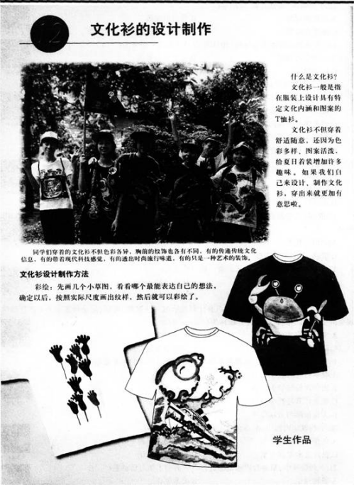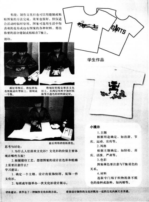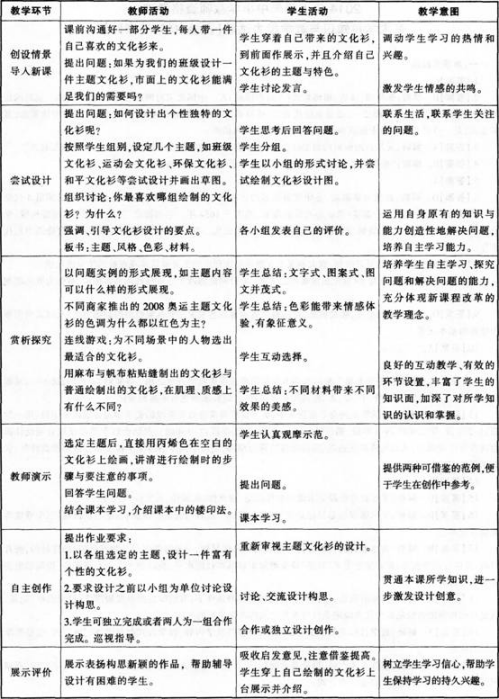 解析 【参考设计】 课题:文化衫的设计制作 教学目标: 知识与技能:了解文化衫的概念和特点及其在生活中的作用。学习文化衫的设计制作方法。能够设计有主题的文化衫。 过程与方法:学会用绘制、粘缝、镂印等方法设计制作一件富有个性的文化衫。 情感、态度和价值观:能对文化衫进行艺术审美评价,在今后的生活中善于发现美、创造美并装点和美化自己的生活。 教学重难点: 重点:文化衫的设计构思和个性化风格的表现。文化衫的制作方法。 难点:找到适合主题的元素、符号和色彩,设计出具有个性的文化衫。 教学反思:
