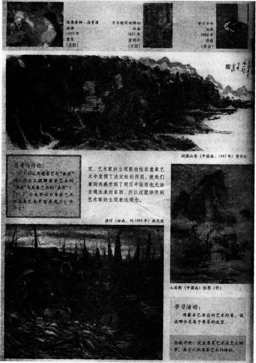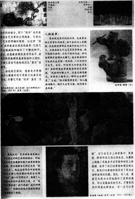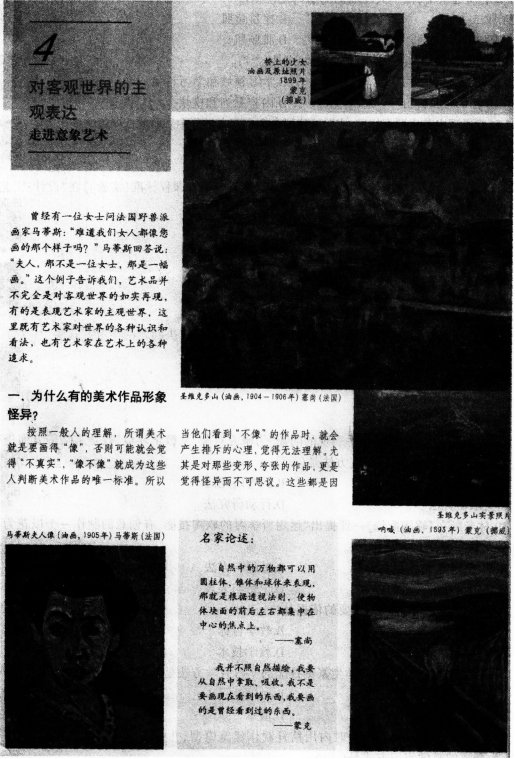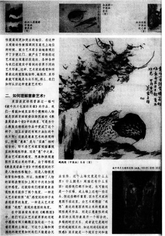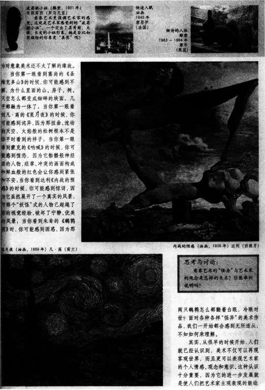 解析 【参考设计】 【课题】对客观世界的主观表达——走进意象艺术 【教学目标】 知识与技能:初步了解美术三大类型之一的意象艺术,学会如何鉴赏意象艺术并能运用美术专业术语赏析意象艺术。 过程与方法:通过分析鉴赏与对比美术作品,了解艺术家的创作观点与视野对意象艺术作品重要的决定性作用:在一定的情景中感悟艺术,用意象艺术来表达自己的情感、观点、思想等。 情感、态度与价值观:通过欣赏中外的意象艺术作品,感悟,增长知识,培养对意象艺术的鉴赏能力.提高欣赏水平。 【教学重难点】 重点:通过教学,使学生分清意象艺术与具象艺术的区别,并初步掌握分辨什么是意象艺术的方法.以及意象艺术的主要特征。 难点:清楚表达什么是意象艺术;如何理解意象艺术;理解意象艺术的创作构思,以及意象艺术和作者个人主观意识的表达。 【教学准备】 多媒体课件,投影仪、意象艺术相关图片 【教学过程】 一、创设情境,激情导人 多媒体导入——教师利用多媒体播放视频,视频内容为两位观众在看到《马蒂斯夫人像》时的争论,学生观看的同时思考并分析:究竟什么是意象艺术,引出课题。 (设计意图:创设人物对话情景,直入主题。并运用PPT课件中的图片开拓学生思维,使学生参与思考,更直观的认识、了解意象艺术作品,激发学生探究的兴趣) 二、探究新知 (一)教师提出问题——什么是意象艺术 让学生欣赏本课的《圣维克多山》油画作品和圣维克多山实景照片,通过对比,从而找到什么叫意象艺术。 让学生试述实景和作品的不同,以及对作品作出初步评价。 (二)课件媒体展示《内战的预感》与《鹌鹑图》。 学生欣赏图片并两两一组讨论“为什么美术作品形象怪异” 学生回答问题,教师补充概括。 (设计意图:通过欣赏分析,让学生分组讨论与交流,有利于对意象艺术作品的理解) 三、巩固提高 教师继续利用多媒体出示图片《呐喊》《星月夜》。并提出以下问题: (一)如何理解意象艺术 (引导学生“意象”是与“写实”相对而言的。) (二)引导学生总结理解意象表现性美术的两个角度。 (设计意图:这一环节要求学生根据教师提供的背景资料,对具体作品深入、全面的剖析,从而学会怎样真正去读懂一幅意象作品,理解意象艺术的创作构思是如何与作者个人的主观意识、生活经验等进行整合与联系的,并抓住这个点深入挖掘拓展,使学生在探究中认识现实物象作用于心灵,经过艺术的创造成为意象的语言,构成心物一体的意象世界) (三)鼓励学生大胆列举意象艺术在生活中的体现。 (设计意图:通过列举身边生活中的例子,使学生拉近和意象艺术的距离。让学生感觉到艺术和生活息息相关,进一步加深理解意象艺术的特征) 四、课堂延伸 (一)教师组织学生用意象艺术的手法表达自己的各种感受。学生分成若干组进行意象绘画练习,体会意象艺术的特点。 (二)展示评价 1.小组派代表上台讲述自己的创作构思.展示学生作品。2.让学生对自己的创作进行解释,谈谈自己在创作过程中是怎样运用意象艺术的语言的。 (三)学生欣赏部分艺术大师的意象美术作品 (设计意图:在这一环节给学生极大的自由发挥与联想空间,以学生为主体,让学生简单地画出图例,阐述自我的想法,然后引导学生自评、互评,肯定学生尝试的结果,尊重学生的个性表现,同时激励全体学生,激发创新意识和独立思考,提高审美能力、表达能力,使学生学会用意象的艺术特点表达自己的主观情感)