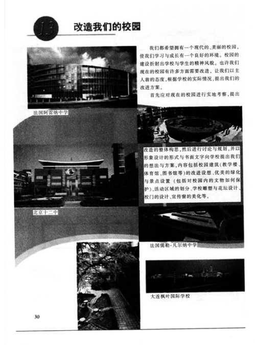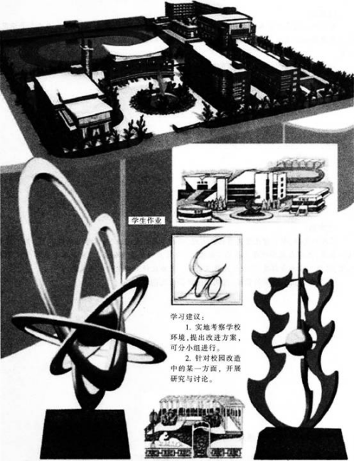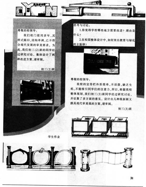 解析 【课题】改造我们的校园 【教学目标】 知识与技能:运用新的设计理念和设计知识,对自己所在学校的环境进行有针对性的研究,进行设计的尝试。并向学校提出建设性的意见与建议。 过程与方法:通过调查、研讨、设计、展示,运用美术知识,对校园建设的理念、校园环境的改造等问题进行探究。提高艺术审美观与综合实践能力。 情感、态度与价值观:通过课题研究过程、研究性学习方式,提高调查研究、综合分析、解决问题的能力和对设计知识的综合运用能力,关注学校的形象与建设,增强主人翁意识和荣誉感。 【教学重难点】 重点:设计新理念。 难点:设计稿的绘制与模型的制作。 【教学准备】 多媒体、不同学校的校园图片、设计模型所需材料等。 【教学过程】 (一)学习设计新理念 教师展示一组国内外优秀校园环境图片,学生欣赏并思考问题: 优秀的校园环境都有哪些共同点 学生思考回答问题。教师总结:除了环境优美之外,还需能体现学校特色以及使用上的方便。 (设计意图:引导学生明确设计理念和原则,引发学生的设计兴趣) (二)讨论改造方案 教师运用多媒体展示自己校园环境的系列图片。组织学生分组讨论: 我们的校园设计有哪些地方需要修改 如果是你的话。你会怎样改造 学生讨论之后,由小组代表回答问题。 教师总结评述,引导学生确定改造主题,并分组讨论改造方案。 (设计意图:鼓励学生讨论,大胆设想,提高学生审美观) (三)绘制方案 小组确定改造方案后,教师指导学生选择绘制平面图或立体图或制作模型等。 (设计意图:培养学生解决实际问题的能力及实践能力) (四)交流、展示、评价 教师组织展示学生的设计,评选出最佳设计,并就学校环境的改造问题作进一步的讨论。 学生分组展示自己的设计成果。并用语言或文字说明,阐述小组创意。 (设计意图:通过作品展示与评价,增强学生的自信心,提高语言表达能力) (五)课堂延伸 师生共同选出一张或几张有想法、效果较好的设计作品进行进一步加工,提交学校作为学生的研究成果,供学校改造时参考。
