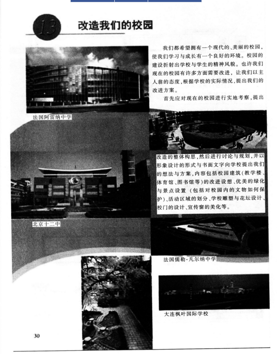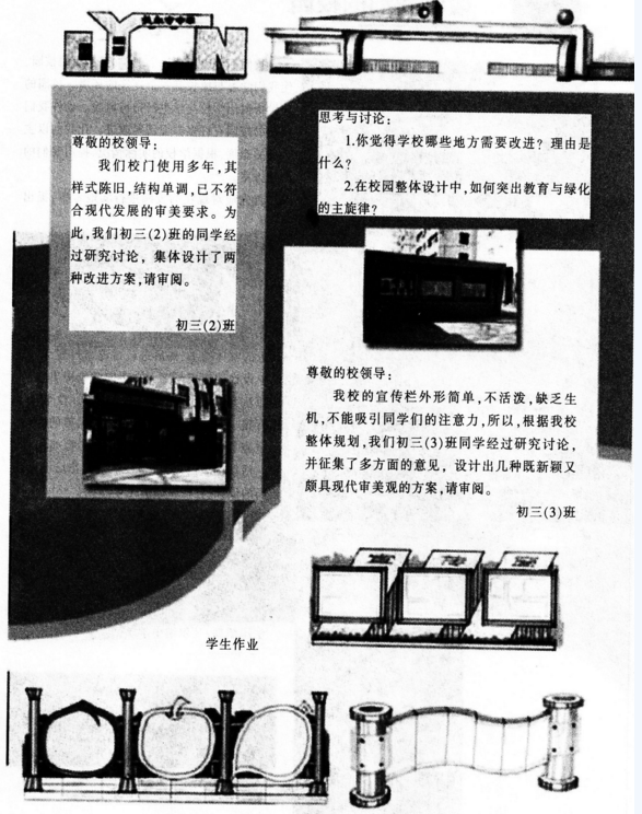 解析 【课题】改造我们的校园 【教学目标】 知识与技能:运用新的设计理念和设计知识,对自己所在学校的环境进行有针对性的研究,进行设计的尝试。并向学校提出建设性的意见与建议。 过程与方法:通过调查、研讨、设计、展示,运用美术知识,对校园建设的理念、校园环境的改造等问题进行探究。提高艺术审美观与综合实践能力。 情感、态度与价值观:通过课题研究过程、研究性学习方式,提高调查研究、综合分析、解决问题的能力和对设计知识的综合运用能力,关注学校的形象与建设,增强主人翁意识和荣誉感。 【教学重难点】 重点:设计新理念。 难点:设计稿的绘制与模型的制作。 【教学准备】 多媒体、不同学校的校园图片、设计模型所需材料等。 【教学过程】 (一)学习设计新理念 教师展示一组国内外优秀校园环境图片,学生欣赏并思考问题: 优秀的校园环境都有哪些共同点? 学生思考回答问题。教师总结:除了环境优美之外,还需能体现学校特色以及使用上的方便。 (设计意图:引导学生明确设计理念和原则,引发学生的设计兴趣) (二)讨论改造方案 教师运用多媒体展示自己校园环境的系列图片。组织学生分组讨论: 我们的校园设计有哪些地方需要修改?如果是你的话。你会怎样改造? 学生讨论之后,由小组代表回答问题。 教师总结评述,引导学生确定改造主题,并分组讨论改造方案。 (设计意图:鼓励学生讨论,大胆设想,提高学生审美观) (三)绘制方案 小组确定改造方案后,教师指导学生选择绘制平面图或立体图或制作模型等。 (设计意图:培养学生解决实际问题的能力及实践能力) (四)交流、展示、评价 教师组织展示学生的设计,评选出最佳设计,并就学校环境的改造问题作进一步的讨论。 学生分组展示自己的设计成果。并用语言或文字说明,阐述小组创意。 (设计意图:通过作品展示与评价,增强学生的自信心,提高语言表达能力) (五)课堂延伸 师生共同选出一张或几张有想法、效果较好的设计作品进行进一步加工,提交学校作为学生的研究成果,供学校改造时参考。