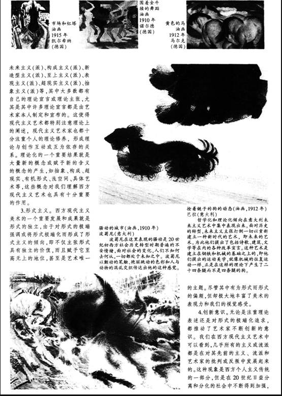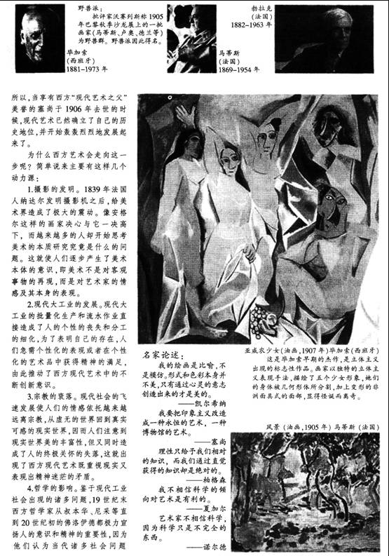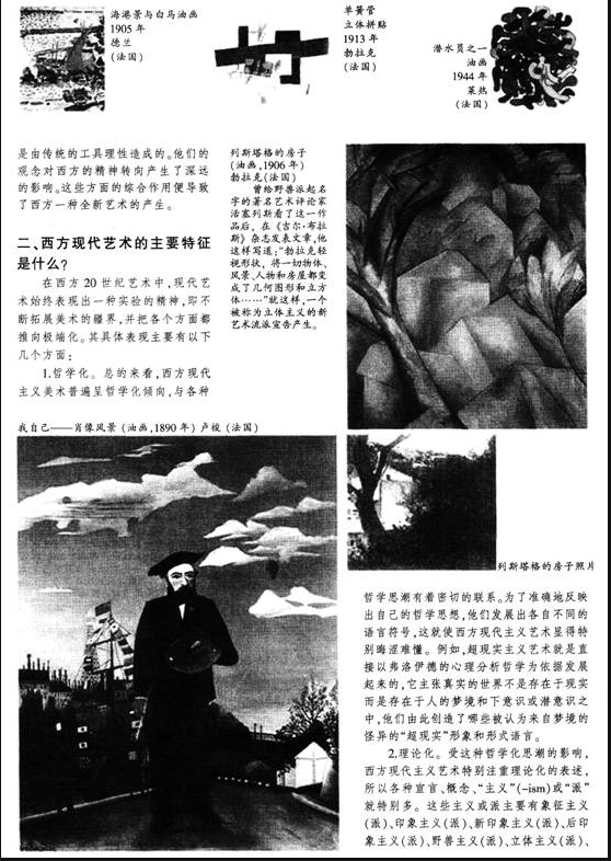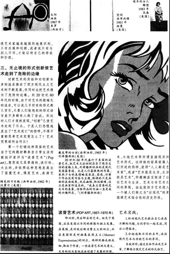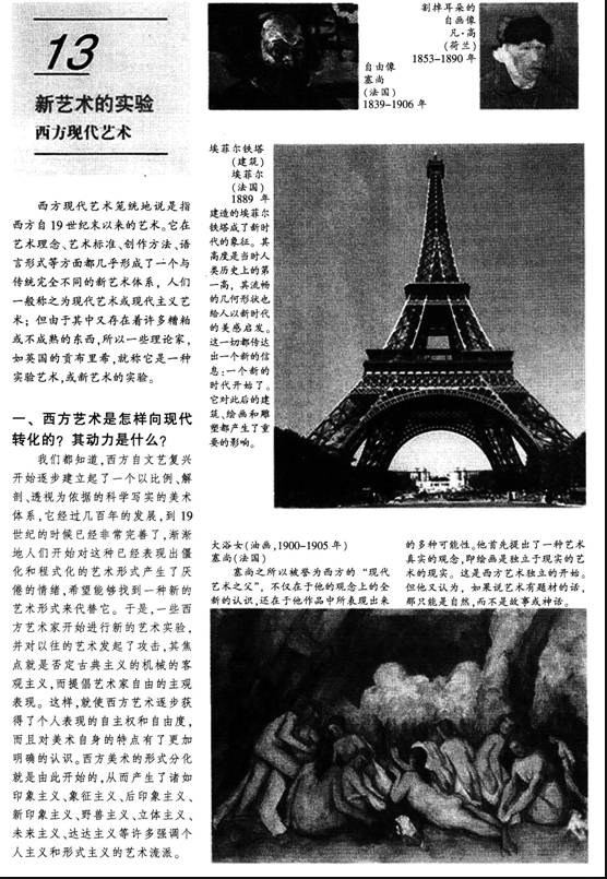 解析 知识与技能:分析理解西方现代艺术产生的背景,能够将艺术作品特点与时代相结合地鉴赏和体会。 过程与方法:通过引导、欣赏、分析,激发学生的参与意识,指导和鼓励学生进行创作,加深学生对西方现代艺术的理解。 情感、态度与价值观:能够从相对全面和客观的角度理解和赏析西方现代美术作品,以提高艺术的鉴赏能力。 【教学重点】艺术作品与时代之间的紧密联系。 【教学难点】具象艺术与意象艺术表现方式的差异。 【教学方法】讲授法、引导法、演示法。 【教学用具】多媒体、课本。 【教学过程】 一、导入 教师用多媒体展示图片导入——展示西方现代艺术的系列作品,引导学生欣赏,导入新课。 (设计意图:展示图片导入的方式,使学生对西方现代艺术有基本感知,为接下来的新课讲授做好铺垫) 二、新知探究 1.西方现代艺术的范围 教师多媒体出示西方现代艺术的范围。 学生熟悉概念并读出:它在艺术理念、艺术标准、创作方法、语言形式等方面都几乎形成了一个与传统完全不同的新艺术体系。 (设计意图:学生在对西方艺术初步感知的基础上,进一步了解并明确西方现代艺术的概念) 2.教师引导学生翻看教材,并提问:西方艺术是怎样向现代转化的?其动力是什么? 学生思考回答问题,教师总结:促成这种转变的动力源有摄影的发明、现代大工业的发展、宗教的衰落、哲学的影响。 (设计意图:培养学生自主学习、善于发现问题以及解决问题的能力) 3.继续利用多媒体展示图片,学生仔细观察思考:西方现代艺术的主要特征是什么? 教师组织学生分组讨论,每组派代表发表各自见解。教师补充总结: 西方现代艺术的主要特征有哲学化、理论化、形式主义、创新意识。 教师追问:尝试分析西方现代艺术在创新方面的努力。 学生小组讨论并汇总答案,教师总结。 (设计意图:学生通过分组合作分析问题,更进一步理解西方现代艺术的主要特征) 4.教师请学生通过阅读教材找出“无止境的形式创新艺术走到了危险的边缘”的时期大概是什么时候? 学生阅读教材,找出答案。 三、巩固拓展 教师多媒体展示题目要求: 1.分组选取不同的名作,谈谈现代艺术与传统艺术的异同。 2.通过具体作品及艺术家,了解西方现代艺术的形式语言。 学生可独立或者合作完成以上题目。 (设计意图:通过学生独立或合作完成教师布置的课堂作业,进一步巩固学生对鉴赏西方现代艺术基本方法的掌握) 四、课堂小结 师生共同总结关于西方现代艺术的发展历程及主要特征,提示学生课下可以通过多种渠道查阅资料,将自己的所想所感以书面形式表达出来,下节课同学之间交流分享。 (设计意图:培养学生的审美能力以及提高学生对世界多元文化的认知水平) 【板书设计】 新艺术的实验——西方现代艺术 主要特征:哲学化、理论化、形式主义、创新意识 【课后反思】(略)