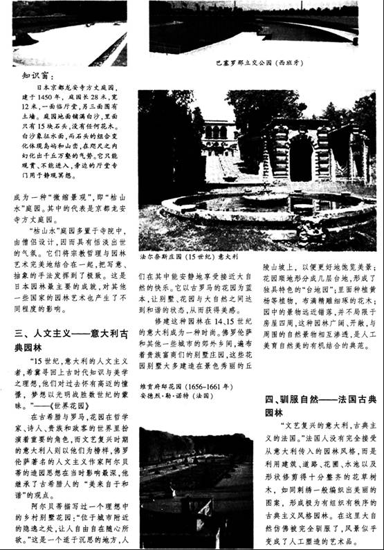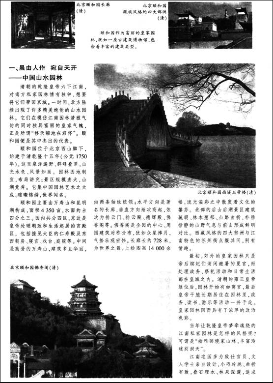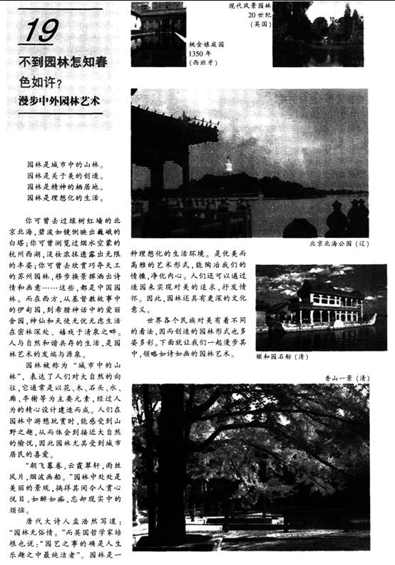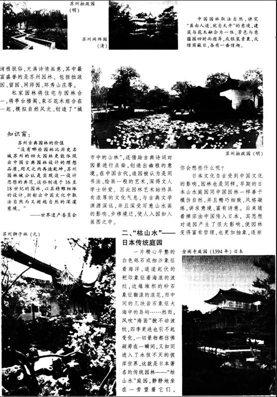 解析 【课题】不到园林怎知春色如许——漫步中外园林艺术 【教学目标】 知识与技能:了解中外园林的性质、功能以及造型特色,体会中华文化的博大精深; 过程与方法:通过讲述与欣赏,领会中国园林艺术的精髓,对中外园林艺术概貌有总体认识,能够客观评价中国园林在世界上的地位、意义及价值: 情感、态度与价值观:增强民族自豪感,同时拓宽眼界、兼容并蓄,并能更好地理解民族传统,将其发扬光大。 【教学重点】了解中外园林的主要流派及其特征,建立对园林艺术概况的认识,培养初步的鉴赏能力。 【教学难点】探索不同园林艺术流派的产生原因及发展脉络,从而学会分析艺术现象背后的本质原因和决定因素。 【教学方法】讲授、演示、讨论。 【教学准备】多媒体课件、相关图片及视频等。 【教学过程】 (一)导人 通过提问同学们曾经游览过或者通过电视、杂志等媒体了解过哪些园林建筑,说出其中学生们最喜欢哪个来导入本课。 教师展示一段苏州园林和西方几个典型园林的视频介绍,综合了解园林艺术,并引导学生介绍自己最感兴趣的园林。 学生感受、欣赏、简单回答,教师总结,引入新课。 (设计意图:通过创设情境以及师生问答的形式引出新课,充分引起学生注意,激发学生的学习兴趣,为新课讲授做好铺垫。) (二)中国山水园林 教师多媒体展示颐和园、拙政园、留园、网师园等著名园林,并提出问题: ——中国园林大致分为哪两类? ——它们在表现上分别有什么特点? ——苏州园林有什么独特风格?有哪些典型代表? 学生观看多媒体展示,通过了解课本内容回答老师提出的问题。总结出中国古典园林写仿自然、寄情山水的艺术特色。 (设计意图:通过对中国园林艺术的直观感知。使学生大致了解中国古典园林的分类及艺术特色) (三)日本传统园林“枯山水” 教师多媒体课件展示日本东京龙安寺方丈园,提示学生观察欣赏其独特的艺术特色。学生欣赏讨论,明确枯山水的独特风格。 师生共同总结出:枯山水的园林艺术是与宗教哲理相结合的艺术,善用沙石创造氛围。阐明日本园林与中国园林的渊源和发展演变过程及对西方园林的影响。 (设计意图:师生观看图片,通过日本园林与中国园林的对比,得出日本传统园林“枯山水”与宗教哲学的联系) (四)西方三国古典园林 教师展示图片,意大利《法尔奈斯庄园》、法国《维贡府邸花园》、英国《布伦海姆风景园》。展示讲解过程中适时提出问题: ——分析比较三国古典园林各自的特色。 ——他们与中国古典园林相比有何不同? 学生伴随多媒体展示,欣赏各国优美的古典园林艺术精品,同时完成相关问题,最后总结出:三国均有不同的造园风格,英法两国古典园林具有代表性的造园大师及其作品。 (设计意图:学生在了解东方古典园林的基础上,进一步了解西方古典园林艺术) (五)现代景观园林 教师用多媒体展示丰富多彩的现代园林艺术,让学生继续开阔视野,欣赏了解现代园林艺术的实用性、多样性和开放性。 (设计意图:开阔学生眼界,培养学生的审美能力,提高美术素养) (六)回顾总结 师生共同回顾本课的教学重点:欣赏和比较、分析了中外古典园林艺术重要作品及其风格、特点,认识到园林艺术和人类生活的密切关系和他的独特意义。 【板书设计】 不到园林怎知春色如许——漫步中外园林艺术 中国山水园林—— 日本传统园林“枯山水”—— 西方三国古典园林—— 现代景观园林—— 【课后反思】(略)