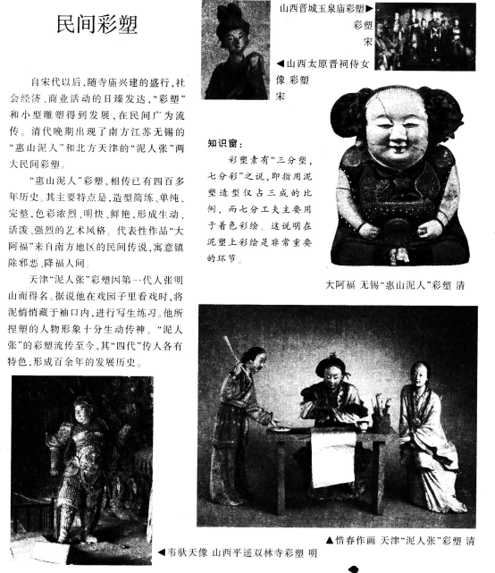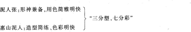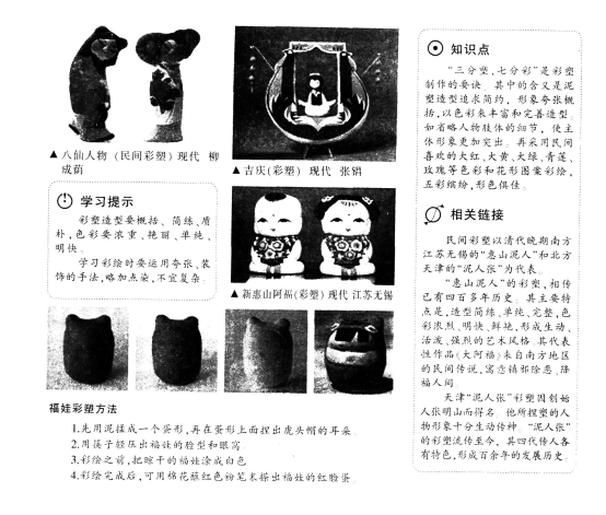 解析 【课题】民间彩塑 【课时】1课时 【教学目标】 知识与技能:了解民间彩塑的表现特征,初步理解“三分塑,七分彩”的含义,并且尝试制作一件彩塑作品。 过程与方法:通过对《大阿福》《惜春作画》等民间彩塑作品的观赏、比较、探讨和实践等,认识民间彩塑的特 点,并且通过实践掌握制作要领。 情感、态度与价值观:感受制作过程的愉悦,增强热爱民间传统艺术的情感。 【教学重难点】 教学重点:了解民间彩塑在色彩与造型上的特点及其制作方法。 教学难点:根据民间彩塑的特点创作一件彩塑作品。 【教学方法】 示范法、讨论法、情境法 【教学准备】 多媒体课件、泥、颜料、棉花、红色粉笔、筷子等 【教学过程】 (一)设置情境.导人新课 播放梦娃公益广告,引导学生观看并提出问题:梦娃的形象是由什么创作形式创作的梦娃形象有什么 特点 学生回答,教师总结:梦娃的形象以彩塑的形式创作,出自天津泥人张。 (二)作品赏析,认识彩塑 1.介绍民问彩塑的概况,讲授民问彩塑是我国民问艺人独创的一种雕塑的样式。 2.多媒体展示《惜春作画》《大阿福》泥塑作品,并提出问题:这些作品表现了什么内容 学生欣赏并回答,教师概括总结:《惜春作画》是以《红楼梦》为题材进行创作的,而《大阿福》表现的是民间 传说。 (三)交流探讨,探究彩塑 1.继续展示彩塑作品《惜春作画》《大阿福》,引导学生观赏并思考问题:这些泥人有什么特点 学生分组讨论回答,教师总结:①惠山泥人——造型简练、单纯、完整,色彩浓烈、明快、鲜艳。②天津泥人 张——形象生动传神,用色简雅明快。 2.教师讲授彩塑“三分塑,七分彩”的含义:泥塑造型追求简约,形象夸张概括,以色彩来丰富和完善造型。 (四)示范练习,创作彩塑 1.教师示范福娃彩塑方法 (1)把泥揉成一个蛋形,并在蛋形上面捏出虎头帽的耳朵。(2)用筷子轻轻压出福娃的脸形和眼窝。 (3)彩绘之前,把晾干的福娃涂成白色。 (4)根据特点进行上色。 (5)彩绘完成后,用棉花蘸红色粉笔末搽出福娃的红脸蛋。 2.作业要求 仿制福娃彩塑或者选取自己喜欢的彩塑作品进行仿制,要突出其在色彩与造型上的特点。学生实践.教师巡视指导。 (五)展示评价,小结作业 1.学生自愿展示作品,并从造型、色彩等几个方面进行自评、互评。最后由教师点评。 2.总结民间彩塑的特点,并结合实践谈谈对“三分塑,七分彩”的体会。 思考问题:这些民间彩塑作品所表达的含义是什么 学生回答,教师总结:表达了对美好生活的憧憬,体现出积极乐观的生活态度。 3.多媒体展示现代的民间彩塑作品《中国梦》系列,引导学生欣赏,感受民间彩塑的魅力。 4.作业:搜集民间彩塑作品并找一找还有哪些民间彩塑。 【板书设计】