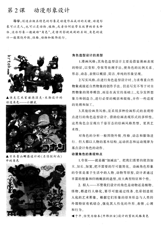 解析 【课题】动漫形象的设计 【课时】1课时 【教学目标】 知识与技能:认识动漫形象的设计风格和表现特点,了解动漫的表情、动态设计,掌握动漫造型的绘制步骤.能够设计一个动漫形象。 过程与方法:通过欣赏优秀动漫形象,探究动漫形象设计的特点、形式和表现方法,了解动漫形象设计的方法.并将其用于课堂实践创作中。 情感、态度与价值观:通过动漫形象的设计及表现,提高观察力、想象力及艺术创造力,激发美术创作的兴趣,丰富学生的校园学习生活。 【教学重难点】 教学重点:了解动漫形象的表情、动态设计方法和动漫造型的绘制步骤。教学难点:设计出个性鲜明、极具特色的动漫形象。 【教学过程】 环节一:导人新课 播放动画片《喜羊羊与灰太狼》主题曲,提问:歌曲出自哪里里面有哪些主人公你们还知道哪些动漫明星学生回答,教师总结:动漫之所以受大家喜爱,是因为它生动有趣。引出课题。 环节二:新课讲授 1.提问:什么是动漫形象常见的形象有哪些学生回答,教师总结:动漫形象可以是人,也可以是动物、植物.或者任何能带来故事的非生命体。动漫形象设计一般围绕外貌、性格、动态和服饰进行,但大都以人物的基本结构、运动状态、运动规律为基点设计动作。 2.展示捷克艺术家兹德涅克.米勒设计的动漫角色——小鼹鼠,日本青山刚昌设计的《名侦探柯南》中的角色,于平、任凭为绘本《牛郎织女》设计的剪纸风格角色,吴冠英、韩美林等人为第29届奥运会设计的吉祥物角色福娃。 提问:动漫角色造型设计有哪些类型请学生把上面的动漫形象进行分类——漫画风格、写实风格、其他绘画类风格。 3.动漫角色的表情设计有什么特点呢 对比赏析:真实形象的表情与动漫角色的表情。着重讲解笑、哭、怒、惊四种表情。总结动漫角色的五官表情设计方法:笑:嘴角上翘或张大、眼睛变细、变弯,画调皮的笑时,眉毛上下错动一定距离,并且让两只眼睛有些差距.也可以将舌头画出来。哭:眉毛、眼角往下倾斜,张大嘴或嘴角向下,脸上挂泪或爆发出来。怒:眉毛上竖,嘴角下扣,眉头紧锁。惊:张大嘴,瞪大眼,眉毛往上飞起。 4.动漫角色探究赏析:以人物动态为例探究。学生上台表演动作,学生找动态关节点。教师总结动漫角色的动态设计的关键:把握关节点。 5.教师示范:动漫角色的设计步骤 以人像为例:①画草图;②勾线稿;③铺底色;④完善。教师边示范,边讲解。 环节三:实践展评 实践:尝试设计一个动漫角色,为设计的角色想象一个故事环境,感受动漫角色在动漫作品中的重要性。实践过程中,教师巡视指导。 展评:学生完成后,设置“今日我是动漫师’’活动,鼓励学生上台展示作品,鼓励学生自评、互评,最后教师总评。环节四:小结作业 小结:总结本课动漫形象的设计步骤和方法,肯定学生的课堂表现,让学生体验到成功的乐趣。作业:为动漫角色写一个故事,以文字的方式呈现出来。 【板书设计】 动漫形象的设计 角色类型:漫画风格、写实风格、其他风格表情特点:笑、哭、怒、惊 动态特点:把握关键点 设计步骤:(1)画草图;(2)勾线稿;(3)铺底色;(4)完善。