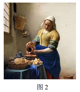 解析 该图为荷兰小画派代表画家维米尔的作品《倒牛奶的女仆》。维米尔的作品大多是风俗题材的绘画,基本上取材于市民平常的生活。《倒牛奶的女仆》表现了一个健壮的女佣倒牛奶的瞬间。左边墙角有一窗户,画家采用了较低的视点,让人物矗立在朴素的白墙前,晨光从画面左侧的窗户温和地泻进厨房内,一切看起来是那么自然、平静。画作构图稳重,光影渐变清晰,给人以舒适之感,观者好像能听到牛奶从罐子里缓缓流入盆中的声音。