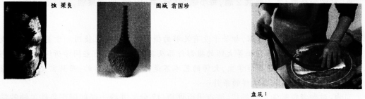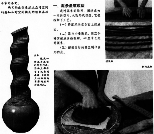 解析 【参考设计】 【课题】火与土的艺术——陶艺成型工艺 【课时】1课时 【教学目标】 知识与技能:了解陶艺在造型方面的特点以及陶艺成型的方法,并运用泥条盘筑成型的方法进行创作。 过程与方法:通过阅读、观察等方法了解陶艺艺术的特点,并通过实践练习掌握泥条盘筑成型的方法,提高动手实践能力。 情感态度与价值观:养成对陶艺的浓厚兴趣,热爱传统的优秀陶艺文化.尊重多元文化。【教学重点】 泥条盘筑成型方法。 【教学难点】 运用泥条盘筑的方法创作一件陶艺作品。 【教学方法】 讨论法、示范法。 【教具准备】 多媒体课件、陶艺用具、陶艺作品。 【教学过程】 活动一:设置情境,导入新课 教师用多媒体播放凤凰卫视关于中国陶艺在巴黎展出的新闻,引导学生观察并思考问题:看完这则新闻,你能从中获得什么信息 学生自由回答,教师总结:欧洲人了解中国是从陶瓷器开始的,所以中国的英文名字是China。陶艺有着悠久的历史,让我们共同粗略地领略一下我国传统的陶艺作品。引入课题《陶艺成型工艺》 活动二:仔细观察,感知陶艺 1.教师讲授陶艺概念:陶艺是运用陶瓷材料和工艺进行的一种艺术创作活动,是一门以手工成型为主的造型艺术。 2.教师展示陶艺作品——陶器与瓷器.引导学生对比观察分析,并提出问题。提问:这两件陶艺作品有什么不同 学生观察思考,教师总结:陶艺分为瓷器与陶器,材料有所不同。活动三:交流探讨,认识成型工艺 教师展示《生命》,并且引导学生观察,小组讨论问题: 提问:这件陶艺作品在造型上有什么特点它是如何制作而成的 学生交流探讨,教师总结:这是一件泥条成型的陶艺作品,器物上部保留了泥条的痕迹,自由向上的动感与圆滑的底部形成对比。 3.教师展示柳条、草绳编织物并引导学生对比观察,思考问题。提问:泥条盘筑和柳条、草绳编织有什么相同和不同 学生讨论回答,教师总结:泥条盘筑是依次进行盘筑。而草绳、柳条编织物需要进行交错编织。活动四:教师示范,学生体验 1.简单介绍泥条盘筑成型的原理:通过泥条的排列、围绕成为一定的空间,从而形成器形。2.布置学生活动:画出一件笔筒或者花瓶的简易设计稿。 3.教师边示范,学生边操作。(1)将湿泥块揉成团。 (2)去除少量陶泥,搓成食指粗细、30厘米长短的泥条。(3)制作圆形的底。 (4)围绕器底进行环绕盘筑,同时在泥条之间刷上一层泥浆并施加一定的力量,使泥条粘结牢固。(5)将缝隙抹平。 活动五:实践展评,小结作业 1.学生自愿展示作品。并且从造型、泥条成型、方法运用等方面进行自评、互评、师评。 2.多媒体展示陶艺作品.教师引导学生观赏并总结陶艺的特点以及泥条盘筑成型的步骤。3.课后作业:课后参观陶艺工作室,思考成型方法还有哪些 【板书设计】