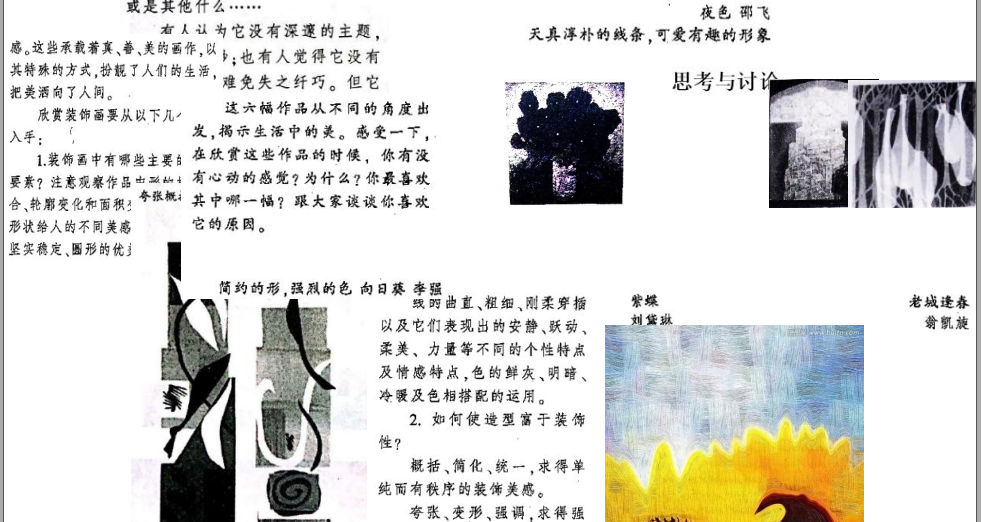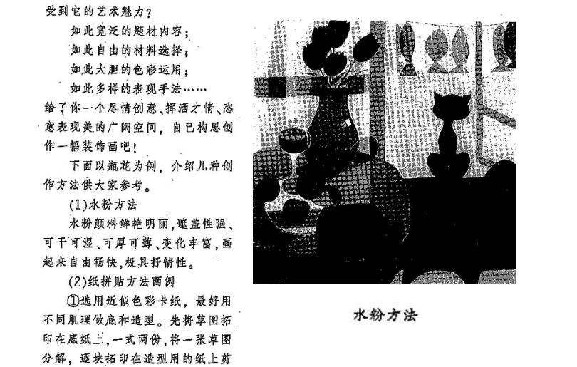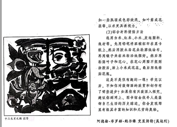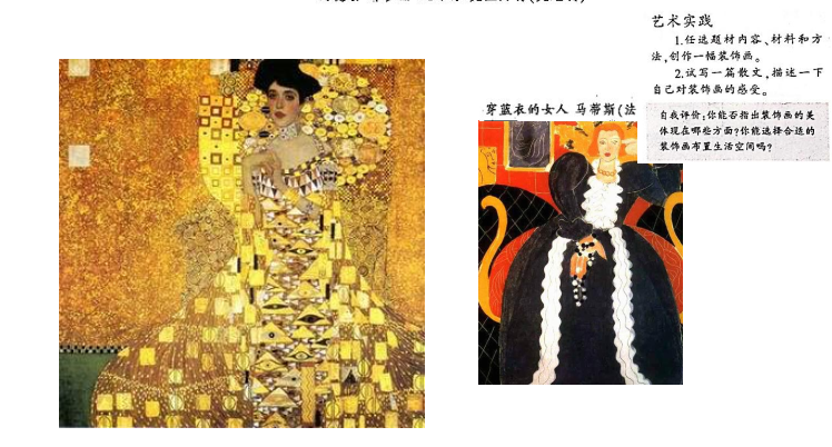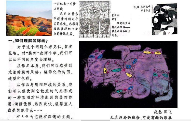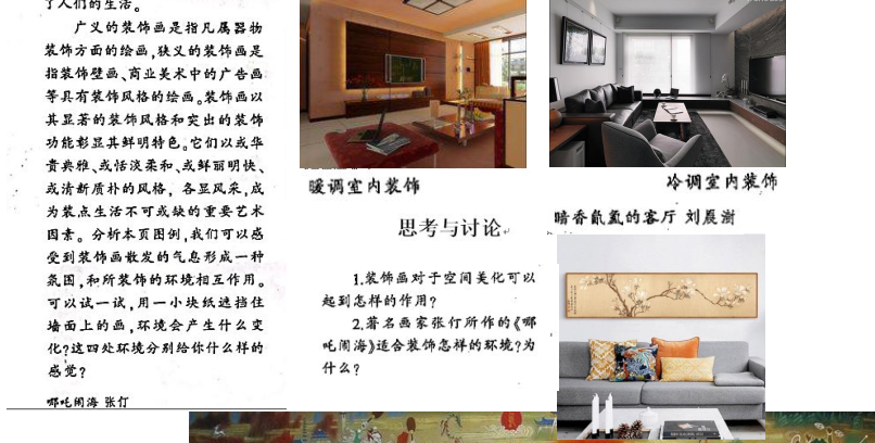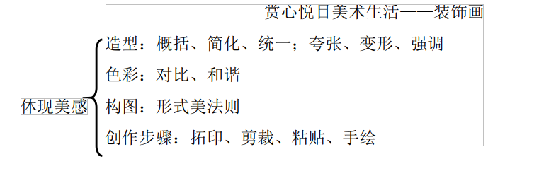 解析 【课题】赏心悦目美化生活——装饰画 【课时】1课时 【教学目标】 知识与技能:了解装饰画的概念、艺术特点,并且学会运用纸拼贴法创作一幅装饰画。 过程与方法:通过欣赏、描述、分析、比较、实践,理解装饰画的作用及其特点并且创作一幅装饰画,提高造型能力。 情感、态度与价值观:提高热爱生活、热爱自然的情感并养成善于观察的好习惯。 【教学重难点】 教学重点:了解装饰画的特点及其创作方法。 教学难点:能够根据装饰画的特点创作一幅装饰画美化生活。 【教学过程】 (一)导入新课 教师展示一些绘画作品,包括装饰画、中国画、油画等,引导学生观察,并要求学生从绘画作品中选择一件作品装饰房间。 学生思考并回答,教师引导学生思考为什么装饰画更受青睐,从而引出课题。 (二)新课教学 活动一:认识装饰画 1.教师提出问题:为什么大家都选择装饰画?什么是装饰画? 学生阅读教材并回答,教师总结:装饰画广义上是指器物装饰方面的绘画,狭义上则指装饰笔画、商业美术中的广告画等具有装饰风格的绘画。 2.教师展示一系列的装饰画作品,并提供几个不同风格的房间图片,要求学生为不同的房间选择不同的装饰画,并引导学生思考:为什么这样选择? 学生思考并回答,师生总结:从作品与周围环境的关系看,装饰画散发的气息形成一种氛围(清静幽雅、热烈欢快、温馨宜人等),从而对环境起到装饰作用。 活动二:理解装饰画 1.教师继续引导学生观察并思考:作品的装饰美感体现在哪些方面? 学生交流探讨,教师总结:造型、色彩、构图。 2.教师展示装饰画作品,引导学生从造型、色彩、构图等方面分析探讨。 学生交流探讨,师生总结:造型上追求概括、简化、统一,求得单纯而有秩序的美感;同时也追求夸张、变形、强调,求得强烈而有个性的装饰美感;色彩上比强烈;构图上充分运用形式美法则。 活动三:示范装饰画 教师示范纸拼贴装饰画的创作步骤: 1.选用近似色彩色卡纸拓印、剪裁并粘贴。 2.手绘添加肌理与色彩效果。 (三)实践展评 1.教师布置活动要求:运用纸拼贴法创作一幅装饰画。 2.学生创作,教师巡视辅导。 3.学生展示作品,同学互评,教师点评。可从色彩、造型、构图等方面进行评价。 (四)小结作业 1.师生共同回顾装饰画的特点及其创作方法,教师引导学生关注生活,热爱生活。 2.教师让学生课后搜集一些适合装饰卧室的装饰画作品。 【板书设计】