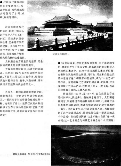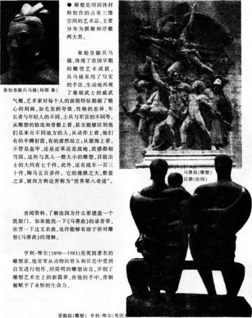 解析 【课题】《在美术世界中遨游》 【课型】新授课 【课时】1课时 【教学目标】 (1)知识与技能:了解美术的分类,掌握对各种美术作品造型方式、表达方式和形式美感的赏析技能。 (2)过程与方法:通过大量美术作品的欣赏。教师正确引导,对中西作品分析比较,让学生在了解美术的基础上对美术有一个清晰的认识,并能够正确掌握美术作品分类,学会用新型的美术材料来体现美。 (3)情感、态度与价值观:通过对美术作品的分析评价,让学生了解美术作品是人类的宝贵财富,培养学生对美术学习的兴趣。让学生打破时空,不拘一格地在美术世界中寻找美,发现美,从而创造美。 【教学重点】 让学生对各种美术作品的造型方式、表达方式和形式美感进行了解和掌握,从而进行对美术作品制作材料的分析比较。 【教学难点】 具体分析、理解本节课所学的内容,使学生能够独立、正确地理解美术作品所用材料的不同而带来的不同画面效果。 【教学方法】 讲授法、讨论法、创设情景法。 【教学用具】 多媒体、课本。 【教学过程】 环节一:组织教学 教师准备好上课所需教具,维持课堂秩序,师生常规性互相问好,准备上课。 (设计意图:组织教学,学生能够安静下来,进入学习的状态) 环节二:激趣导课 以问题激发学生: ①你们见过哪些美术作品 ②它们的材质分别是什么呢 并以展览的形式把老师和学生课前收集的图片布置在教室的墙壁上,让学生带着问题互相欣赏,向学生展示美术世界的丰富多彩,由此引出课题。 (设计意图:为学生创设一种置身于美术作品之中的氛围,引起学生的学习兴趣) 环节三:讲授新知 ①欣赏课本上的图片,提出问题:如图《父亲》《秋瑾》,“同样是画人物,它们有什么不同 ”让学生在思考探究中对本节课所学的内容产生好奇,感受不同材质带来的不同效果。 ②在学生思考的同时给学生准备一些不同种类的绘画工具,像国画工具、油画工具、水彩画工具以及其他种类的绘画工具给学生看。让学生能正确地判断出美术作品是用哪些绘画工具完成的。教师小结:美术的四大主要门类有:绘画、雕塑、建筑、工艺美术。绘画又包括中国画、油画、水彩画、版画等。 ③教师首先充当导演,让学生在游戏中,一边看作品,一边正确地找出作品使用的材料。让学生甲指出油画《父亲》,学生乙找出油画用的材料;学生甲出示卡片“浮雕”,学生乙找出书上图片中的浮雕;学生甲出示“水彩画”的卡片,学生乙就要从课本外找出一张水彩画的作品。让学生在游戏中分清楚作品是用什么材料完成的。 然后,回到课本上的图片,具体地分析每幅作品。由于材质的不同,使得美术作品效果截然不同。以学生的探究为主,教师适当地加以补充。 ④为了检验学生掌握知识的程度,教师又从课本之外找了一些不同种类的图片,让他们做出比较。 (设计意图:在这一环节,主要让学生通过对图片的大量欣赏比较,自己体验美术作品由于材质的不同所带来的不同效果) 环节四:思考讨论 了解美术四大类后。教师继续让学生对刚才所观看的图片进行讨论: 《家庭组》和《马赛曲》同样是雕塑,表现手法不同,效果有什么不同 通过《出水芙蓉》《天坛祈年殿》看出中国画与中国古建筑之间有什么联系 在探究欣赏比较中让学生了解本节课的学习内容,掌握不同材质的基本特点。 (设计意图:在整个教学过程中,通过课外的探索与发现,学生能对本节课有一个整体的认知与提高) 环节五:展示评价 学生积极主动表述关于上述两个提问的想法,同学互评,教师小结。 (设计意图:展现自己,巩固新知,共同发现知识点遗漏部分) 环节六:教师总结 本节课通过对图片的大量欣赏,让学生在了解美术的四大门类中,感受祖国那份几千年来沉甸甸的美术文化。学生通过对美术作品直接的感受,引导学生观察作品,让学生看出不同画种的不同效果。使学生能够独立、正确地从美术作品中,按工具材料的不同认识美术作品的门类。 (设计意图:加深对整个教学过程的印象和体验,同时又是对整节课的总结和梳理) 环节七:课后拓展 教师引导学生关注生活中的新材料、新美术,将美术的学习空间和生活紧密联系在一起。 (设计意图:有助于学生形成热爱美术、热爱生活的思想情感) 【板书设计】 在美术世界中遨游 美术的四大主要门类有:绘画、雕塑、建筑、工艺美术。 绘画:中国画、油画、水彩画、版画等。 【教学反思】()