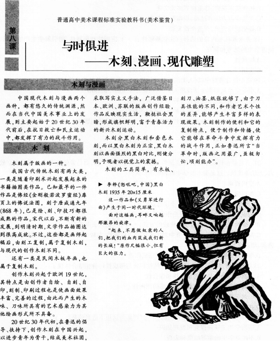 解析 【课题】与民族共命运——木刻与漫画 【课型】新授课 【课时】1课时 【教学目标】 知识与技能:了解木刻既有传统渊源又是新兴的美术门类的特点和发展脉络。 过程与方法:学生认识美术的社会作用,体会文艺家对国家民族的使命感。 情感、态度和价值观:提高对美术学科的学习兴趣,体验木刻与漫画的神奇。 【教学重点】学生了解版画的分类、作用以及深刻的内涵。 【教学难点】理解版画其中蕴含的情感。 【教学过程】 (一)导入 出示徐悲鸿《奔马》、司徒乔《放下你的鞭子》《“七七”的号角》等作品,引导学生讨论分析作品的时代背景和特殊的意义。 指出:在抗日战争和民主革命运动中,美术家与民族共命运,表现了可贵的爱国热情和历史的使命感。但在当时,以画笔为武器,积极投身于抗日救亡和民主革命运动的最多的是木刻家和漫画家。 (设计意图:以多媒体播放革命版画作品导入,激发学生的爱国情感,顺利引入新课) (二)新课 1.提出问题讨论 木刻的特点与制作方法有哪些 漫画有哪些种类与特点 讨论指出:中国20世纪30年代初期出现由鲁迅倡导,以进步美术青年为主力的木刻创作运动。中国古代木刻版画具有悠久的历史,但这种版画都是刻工复刻画师的原稿,是一种复制木刻。这种木刻大约在14世纪初传到欧洲,到19世纪欧洲产生了创作木刻。创作木刻的特点是不模仿、不复制,刻者自己以刀代笔,以木代纸或布,完全由刻者自己创作,刻家就是画家。 2.作品鉴赏 师:你喜欢哪件作品 (请3位同学发言) 作品有什么样的艺术特色 (反映人民疾苦,揭露黑暗的社会现实) 教师小结:木刻在抗日战争和民主革命运动中发挥过巨大战斗作用,美术家与民族共命运。表现了可贵的爱国热情和历史的使命感。 (三)实践 教师展示李桦的《起来,饥寒交迫的奴隶》和古元《乡政府办公室》两幅木刻版画作品,引导学生四人一小组欣赏讨论。教师巡视指导。 (设计意图:学生运用所学知识及时巩固。大胆发表看法) (四)展示 学生选取代表发表看法,同学互评,教师小结。 (设计意图:展示自己,风采飞扬,教师起到良好的引导与总结的作用) (五)课堂小结 教师与学生共同总结:木刻和漫画创作始终坚持现实主义的创作方法,反映人民疾苦,揭露黑暗的社会现实,成为二十世纪三四十年代最活跃和最有战斗性的美术运动之一。 (设计意图:巩固知识,提升学生对版画的喜爱程度) (六)课外延伸 教师提问:漫画的本义是什么 和我们当今喜欢的漫画有什么不同 漫画有哪些著名艺术家 你喜欢谁的哪件作品 下节课老师就听同学们讲一讲。 (设计意图:以设疑的方式,为下节课做好完美铺垫) 【板书设计】() 【教学反思】()