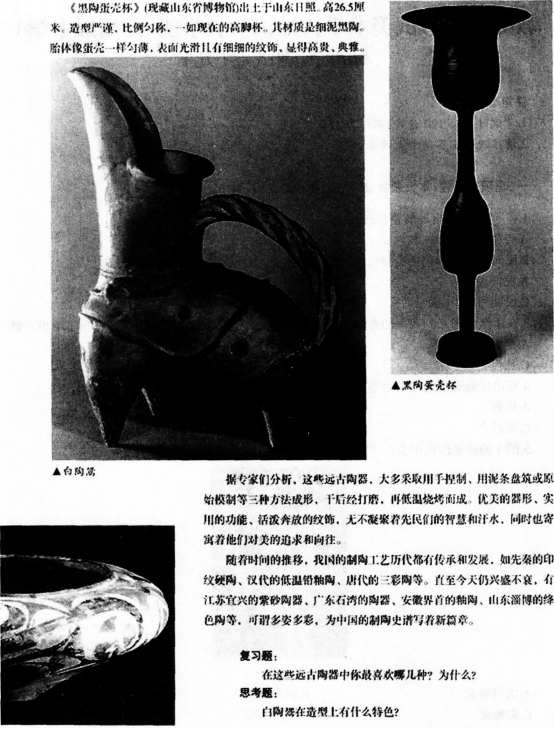 解析 【教学目标】 知识与技能:了解我国史前美术中不同文化的陶器的艺术特色,学会运用正确的方法去观赏陶器,客观地评价古代艺术作品。 过程与方法:通过欣赏、讨论、比较美术作品,感受史前美术的魅力。 情感态度与价值观:了解我国制陶工艺的悠久历史、艺术成就,从而热爱中华民族传统文化。 【教学重难点】 重点:了解不同文化类型陶器的造型特点和艺术特色。 难点:深刻明白彩陶纹饰的艺术特征及其背后的意义,掌握有关历史知识和历史背景。 【教学准备】 教材、多媒体课件、录象带 【教学过程】 (一)导人新课 播放半坡遗址的发现过程视频,1953年春,西安灞桥火力发电厂施工中发现彩陶,中央考古训练班又在泸河东岸半坡村附近发现一处类似遗址的遗迹。确定了是仰韶文化的其中一个分支——半坡文化类型,接下来认识其代表出土物——陶器。 (二)直观感知 首先简单介绍彩陶的定义以及制作过程,其制作温度、用途等。一般的说法,可能是由于沾有黏土的篮子经过火烧之后,形成不易透水的容器,从而得到了进一步的启发。不久之后,便开始出现了塑造成型并经烧制的陶器。特别是随着人类农业经济和定居生活的发展,饮水的搬运和谷物的储藏,都需要这种新兴的容器——陶器,于是它们就大量出现,成为新石器时代的重要特征,在人类生活史上开辟了新的纪元。 (三)形式美感分析 播放多组陶器图片,请同学们思考这些陶器大概的用途有什么 学生自由讨论,教师总结: 汲水器:如《漩涡纹尖底瓶》汲水器; 炊器:有罐、鼎、鬲等: 饮器:杯、角、觚等; 食器:有碗、钵盘等; 盛贮器:有壶、罐、瓮、瓶、尊、盆、缸等。 接着播放半坡遗址出土的彩陶图片。提问:请同学们仔细观察其最主要的纹样是什么 学生自由讨论回答,教师总结:人面鱼纹。 同样的方法,教师与学生一起分析《舞蹈纹彩陶》。 (五)对比分析 请同学们将刚才学习的黄河中上游地区的彩陶与黄河下游山东龙山文化的黑陶作为对比欣赏,总结有何不同 学生自由讨论,教师总结彩陶的制造者很注意图案与器形、视角的关系,力求图案的造型和构成与器形相协调。也注意彩陶图案在不同视角所产生的不同视觉,从而设计出图案在器物上的部位。十分得体地显示出民族文化的风采。黑陶虽然没有丰富的纹样装饰,但是以其高超的制作工艺创造了陶壁薄如蛋壳的陶器作品。 (六)小结作业 总结:彩陶和黑陶代表了我国史前美术的第一次高峰,这些陶器,可以使我们清楚地看到,人类在制作这些最早的生活用器时,就已经根据美的法则在创造。这是人类第一次利用水和火,改变了黏土的形状,改变了黏土的性质,创造了一种新的物质产品,揭开了科学技术史上的第一页。 【板书设计】 【教学反思】()