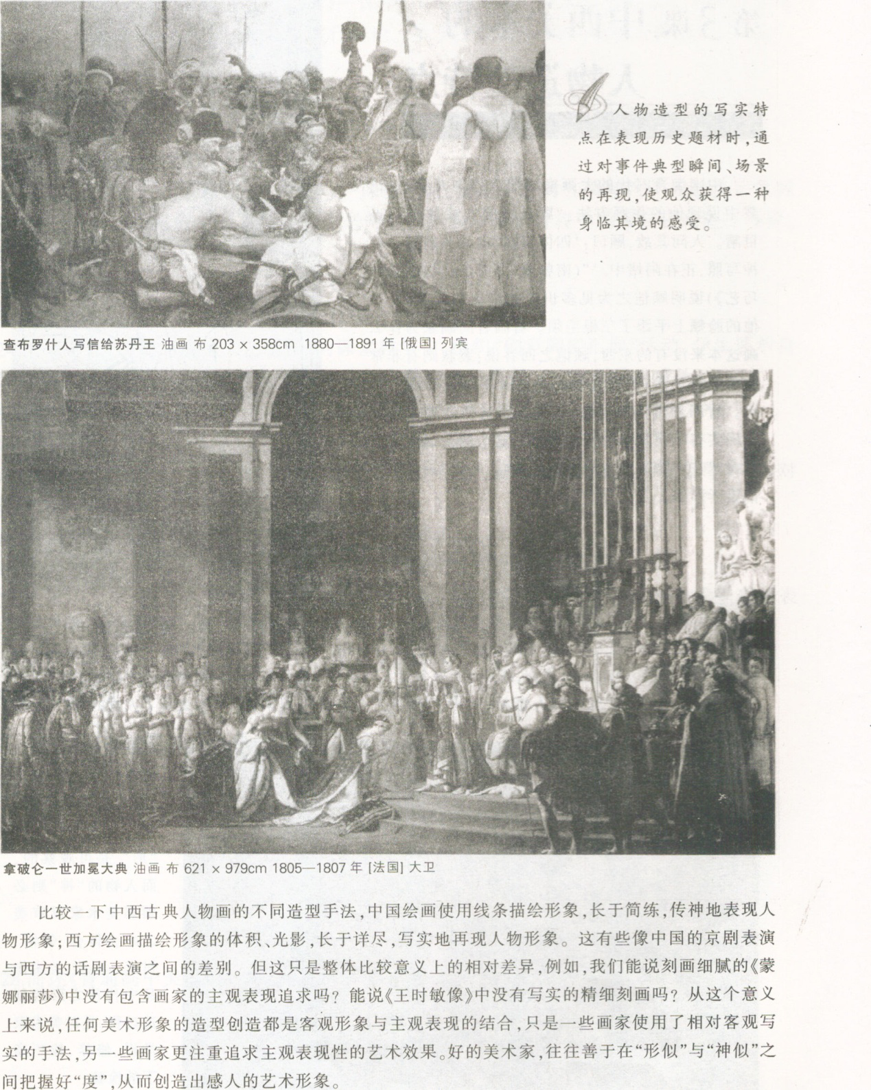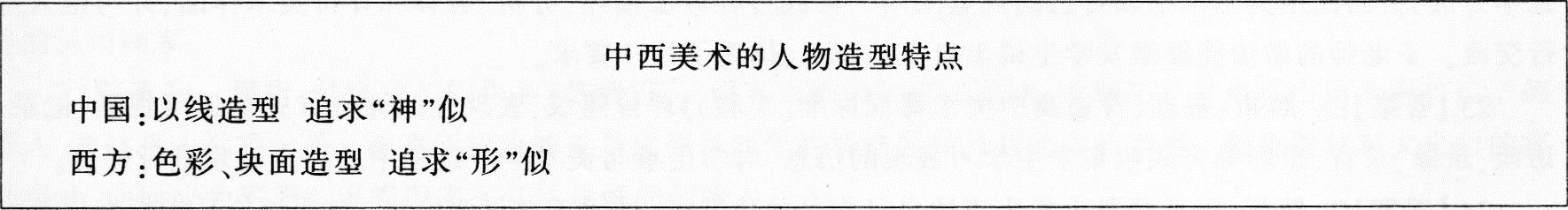 解析 【课题】中西美术的人物造型特点【课时】l课时 【教学目标】 知识与技能:了解中西方美术作品中人物不同的造型手法,体会人物造型在追求“神似”与“形似”方面所体现的不同特点。 过程与方法:通过中西方不同作品中人物的对比,能够掌握分析作品中人物造型特点的方法。 情感、态度与价值观:养成善于观察的良好学习习惯,提升对中西方多元文化的兴趣。 【教学重点】 理解中国美术人物画崇尚“以形写神”的特点,了解西方美术作品中人物造型“写实美与理想美结合”的造型特点。 【教学难点】 能够分析中国式“传神”与西方“理想美”之间的异同.理解艺术的多元化特征。 【教学方法】 讲授法、对比法、合作探究法 【教具准备】 多媒体课件 【教学过程】 (一)讲述故事.激趣导入 教师引导:讲述顾恺之为裴楷画像的故事,激发学生对中国人物画的浓厚兴趣。在长期的历史发展中.中西方都留下了无数旷世奇作,而在人物画美术作品的表现上却有着不同风格特色,以此引入课题《中西美术的人物造型特点》。 (二)新课讲授,感知画面 1.教师用多媒体播放梁楷《太白行吟图》,并提出问题:你们了解的李白具有什么样的性情?画面中可以感受到李白的性情吗?从哪些方面可以感受到呢? 播放结束,学生回答,教师总结:画面通过简括的笔墨,着重抓住了李白的神韵动态。让学生了解中国人物画注重“写神”的特点。 2.教师用多媒体播放达?芬奇《蒙娜丽莎》,并提出问题:画面中人物形象,具有什么的特点?人物的微笑给你怎样的感受? 播放结束.学生回答,老师总结:画面人物通过笑容表现含蓄之美。通过色彩、块面以及明暗将人物的表情神态刻画的真实与极致。 教师将两幅画进行对比,学生观察思考两幅作品对人物服饰、发式、五官等刻画得不同之处,学生讨论,教师引导学生对中国人物画传神与西方人物油画写实特点的理解。 (三)巩固提高,对比鉴赏 教师播放雕塑作品《击鼓说唱俑》与《武士》,学生分组讨论,说出作品的特点与不同。师生共同归总结:雕塑作品中人物形似与神似,不同的特征会给人不同的感受。 教师继续利用多媒体播放《王时敏像》《兵马俑》引导学生探究:在中国人物的表现方式中,也可以通过写实进行表现。 (四)课堂总结 教师进行课堂总结:师生共同进行一节课主要内容的回顾.强调重难点。教师总结绘画与雕塑中,中西人物绘画风格和雕塑作品的不同特点以及表现技法。 (五)布置作业 搜集西方人物造型中有写意表现成分的画作。 【板书设计】