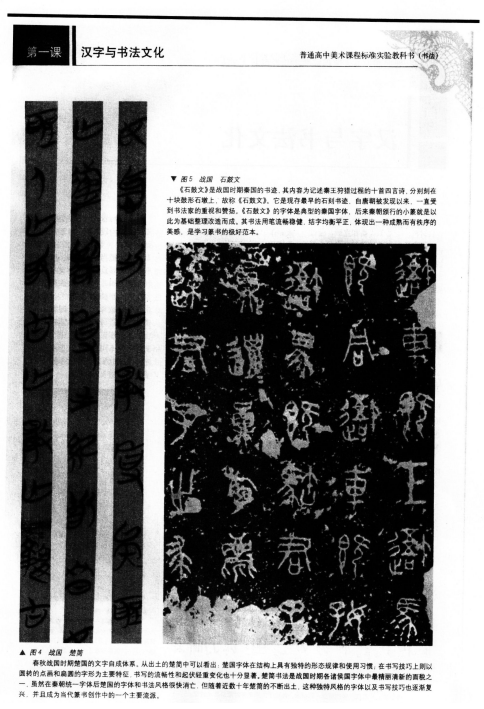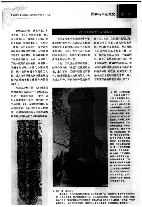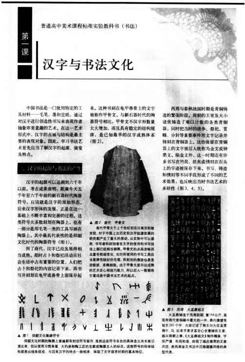 解析 【参考设计】 【课题】汉字与书法文化 【课时】1课时 【教学目标】 知识与技能:了解、熟悉汉字起源和书法产生的过程及书法在中国传统文化中的地位。 过程与方法:通过体验、讲述和探究性学习,激发学习兴趣。 情感、态度与价值观:逐步形成热爱书法艺术的习惯和对待传统文化的正确态度。 【教学重点】 认识和了解汉字起源和书法产生的过程。 【教学难点】 认识书法的艺术性。 【教学过程】 活动一:导人新课 请同学用毛笔、刻刀、钢笔等工具在石膏板和纸上写出自己的名字,比较一下哪种工具写得最好为什么 (设计意图:学生通过动手对比的方式体验,能有效地激发对书法的学习兴趣) 活动二:新课讲授 1.问题:汉字的起源 总结:汉字的产生为书法艺术创造了条件。同学们自学教材第一部分,结合在语文课堂里学过的知识,填写学习卡片。 2.问题:我们班里出板报,要请写字最好的同学去完成,为什么 出示几件石刻拓片、木刻帖和墨迹,请同学辨认,讲述书法实用价值。 3.请有书法基础的同学和没有基础的同学上台书写。 问题:他们的书写有差别的原因是什么 结论:人们在长期使用毛笔的过程中掌握了书写的规律.并促进了书法艺术的成熟。 4.简要辨析例子“三”.说明汉字形式美的原理。 5.书法在传统文化中的地位。“琴棋书画…”“字如其人” 请同学讲两则故事:萧御史智赚《兰亭序》、柳公权“心正则笔正”(可在课前让同学准备好)。 (设计意图:用故事说明书法艺术在人们的生活和传统文化中的地位) 6.书法是以汉字为基础,用毛笔书写的、具有思维特征的抽象符号艺术,它体现了万事万物的“对立统一”, 这个基本规律又反映了人作为主体的精神、气质、学识和修养。 播放录像片段《古代中国书法》,欣赏中感受书法的魅力。 【作业要求】 对自己喜欢的书法种类进行分析,临摹书法。 【板书设计】
