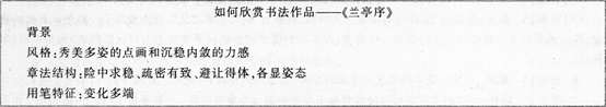 解析 【课题】如何欣赏书法作品——以《兰亭序》为例【课时】1课时 【教学目标】 知识与技能:了解欣赏书法作品的基本方法,掌握《兰亭序》在笔法、结构、章法上的特点。 过程与方法:通过欣赏与讨论感受《兰亭序》的魅力,了解书法特征以及在笔法、结构、章法上的特点。 情感、态度与价值观:感受中国书法的魅力,增加对书法艺术的了解,激发学生对书法学习的热爱。 【教学重难点】 教学重点:赏析书法作品,了解《兰亭序》在笔法、结构、章法上的特点。 教学难点:能够结合书法家的人格、精神等对书画作品进行简单的赏析。 【教具准备】 多媒体课件、图片、教材等。 【教学过程】 活动一:故事导入 教师讲授《墨染池水》的故事,引导学生聆听,并提问:故事中的主人公是谁? 学生思考,教师总结:王羲之。王羲之自幼酷爱书法,几十年来锲而不舍地刻苦练习,终于使他的书法艺术造诣达到了超逸绝伦的高峰,被人们誉为“书圣”。引出课题——传世作品《兰亭序》。 活动二:赏析作品,引导想象 教师展示作品图《兰亭序》,引导学生赏析。教师总结作品时代特征以及背景(永和九年三月初三,王羲之等人在绍兴东南的兰亭举行“修锲”活动)。暮春的兰亭,“天朗气清,和风拂面”。文人雅士们“曲水流觞,饮酒赋诗”。诗篇汇集,名为《兰亭集》,并公推王羲之为之作序。王羲之乘着兴致,以鼠须笔、蚕茧纸写下了文辞优美、书法精绝的“天下第一行书”《兰亭序》。 教师继续展示图片,引导学生赏析,并提问:《兰亭序》的书法风格是怎样的? 学生赏析并回答,教师总结:《兰亭序》用笔细腻,结构多变。书法风格具有秀美多姿的点画和沉稳内敛的力感交织而成的美韵。书法家洒脱不羁的人生襟怀与潇洒如意的笔墨相辅相成,给人们美的享受。 活动三:具体分析 教师引导学生赏析作品,引导学生整体赏析并分析其章法结构具有怎样的特点。 学生赏析回答,教师总结:《兰亭序》前松后紧,具有手稿随意自然的特点,字的间架结构险中求稳、疏密有致、避让得体,各显姿态。20个“之”字无一雷同,各具神采。 教师展示“坐”“丝”“乐”“慨”等字的书写图片,引导学生赏析,并提问:《兰亭序》用笔有什么特征? 学生讨论并回答,教师总结:《兰亭序》用笔变化多端,正锋侧锋、曲笔直笔、转笔折笔,都操控自如,笔势劲敛,无不如意,有清健秀逸之气。 活动四:交流评议,拓展提高 1.回顾本课重难点,了解其基本赏析方法。 2.引导学生课下搜集有关篆书、隶书、草书等书体作品,查找区别。 【板书设计】