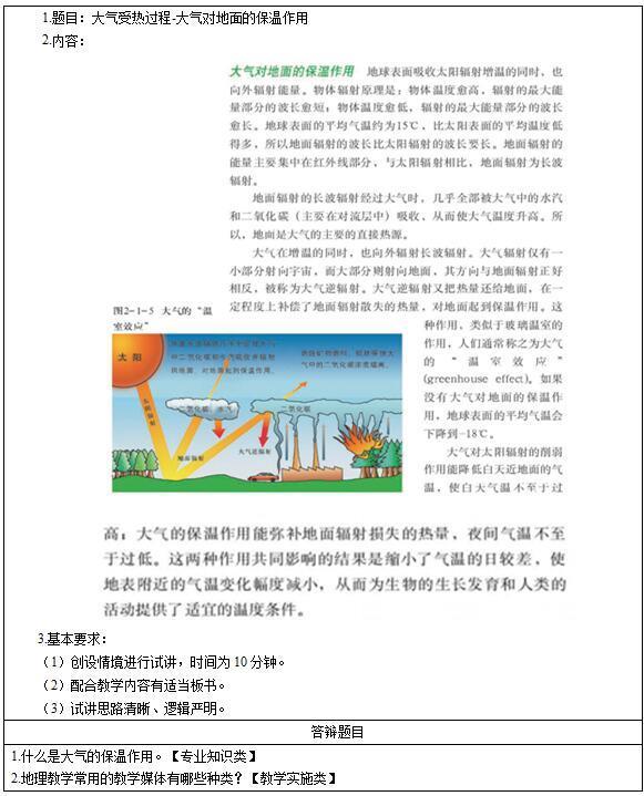 解析 高中地理《大气对地面的保温作用》主要教学过程及板书设计 教学过程 环节一:导入新课 有云的白天气温不会太高,是因为大气对太阳辐射的削弱作用。那有云的夜晚气温又不会太低,后者就是由大气热力作用的另一表现——大气的保温作用形成的。 环节二:新课教学 大气对地面的保温作用 教师:物体温度越高,辐射中最强部分的波长越短;反之越长。因此,相对于太阳短波辐射来说,地面辐射为长波辐射。 展示视频“大气的保温作用”和 “大气的温室效应”图,思考:大气对地面的保温过程? 【教师总结】对流层大气的主要的直接热源是地面。大气吸收地面辐射增温的同时,也向外辐射热量,大气辐射热一部分向上射向宇宙空间,大部分向下射向地面,其方向与地面辐射正好相反,故称为大气逆辐射。大气逆辐射又把热量还给地面,这就在一定程度上补偿了地面辐射损失的热量,对地面起到了保温作用,使地面温度变化比较缓和。 【教师总结】 【知识迁移】举例说明大气的保温作用:①在晚秋或寒冬,霜冻多出现在晴朗的夜晚;②寒潮来临前,北方农田会燃烧秸杆。 知识迁移——温室效应: 读“玻璃温室效应示意图”,理解大气的“温室效应”。借助“玻璃温室效应示意图”解释大气保温作用原理。 【教师总结】综上所述,地球大气对太阳短波辐射几乎是透明体,大部分太阳辐射能够透过大气射到地面上,使地面增温;大气对地面长波辐射却是隔热层,把地面辐射放出的热量绝大部分截留在大气中,并通过大气逆辐射又将热量还给地面。大气的这种作用,类似于玻璃温室的作用,人们通常称之为大气的“温室效应”。 知识迁移——全球变暖: 用大气的“温室效应”解释全球变暖的趋势。 【教师总结】(1)地面辐射是近地面大气(对流层)的主要的直接的热源;(2)太阳辐射是地球上(地面和大气)的根本能量来源;(3)对地面直接起保温作用的是大气逆辐射。 环节三:课堂小结 本节课我们学习了大气的受热过程,通过学习,我们懂得了正因为地球上有大气存在,并且由于地球大气的热力作用,才使得地球表面温度的昼夜变化不像没有大气的月球那样强烈。 板书设计 答辩题目解析 1.什么是大气的保温作用?【专业知识问题】 【参考答案】 大气中的二氧化碳和水汽能大量吸收地面长波辐射,将热量保存在大气中,并通过大气逆辐射的形式把热量返还给地面,这就是大气对地面的保温作用。 2.地理教学常用的教学媒体有哪些种类?【教学实施问题】 【参考答案】 依据地理教学媒体物质属性及其分类功能分为语言、图像、实验、电教、系统五大类媒体。
