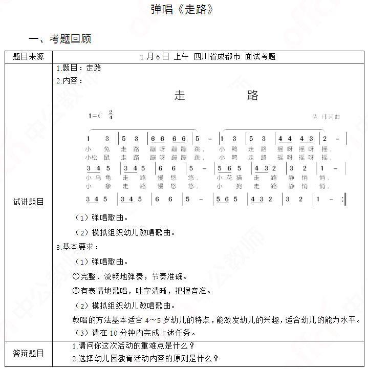 解析 【活动设计指导】 中班音乐活动《走路》 一、活动目标 1.认知目标:感知2/4拍的节奏特点,了解各种小动物走路的样子 2.技能目标:能够用完整地演唱歌曲,用不同的动作表演各种动物走路。 3.情感目标:喜欢参与音乐活动,乐意于同伴分享自己对小动物走路的动作创编。 二、活动重难点 活动重点:理解歌曲内容,能够用活泼的声音完整演唱歌曲。 活动难点:大胆尝试歌曲表演并喜欢参与音乐活动。 三、活动准备 1.物质准备:音乐伴奏、电子琴、教学挂图、动物头饰。 2.经验准备:幼儿已经对各种小动物的形态有了一定的认识。 四、活动过程 (一)活动导入——情景导入 1.教师创设森林动物选美大赛的情景,引起幼儿的兴趣 师:“小朋友们,今天美丽的大森林里在进行一场选美大赛,我们一起去看一看吧。” 播放视频,引出活动主题。 2.教师播放动物走路视频,让幼儿观看 师:“刚才视频里面,我们看到了小兔子、小鸭、乌龟和小猫在选美,它们是怎样走路的呢?我们一起来听一首歌曲吧。” (二)活动展开 1.教师范唱歌曲,幼儿整体感知。 (1)教师声情并茂地演唱歌曲,让幼儿认真聆听。 (2)教师提问“歌曲里面都有哪些小动物出现了呀?” (3)教师提问“它们走路都是什么样子的呢?” 2.幼儿学唱歌曲。 (1)幼儿跟着教师随音乐节奏念歌词。 教师和幼儿做打节奏小游戏,教师先拍一次手,幼儿再拍一次腿,让幼儿从中感受2/4拍的强弱规律,之后教师和幼儿一起边打节拍边念歌词,使幼儿掌握本首歌曲节奏。 师:“我们一起来玩一个关于节奏的小游戏吧,老师先大声地拍一下手之后,小朋友们再轻轻地拍一下腿……,你们发现了2/4拍有什么规律吗?” 幼儿跟随教师轻声地学唱。 教师大声演唱歌曲,让幼儿先小声用“la”哼唱旋律,整体感知旋律。 师:“老师先大声的唱歌曲,小朋友们用la小声跟着老师唱,就像刚才玩的节奏游戏一样,小朋友们准备开始喽。” (3)教师把幼儿难唱准的乐句用手画旋律线单独教唱,纠正错误。 师:“刚才小朋友们唱小鸭子走路的时候还是有一点小小的问题,你们唱的时候看老师画的旋律线,老师的手往上画就是唱高一些,往下滑就是唱低一些。” 幼儿分组比赛演唱,并相互评价。 师:“你们觉得哪一组的小朋友唱得好?为什么呢?” 3.创编歌表演动作,启发幼儿大胆用动作表现小动物走路的样子。 (1)引导幼儿根据歌词创编动作。 师:“小兔子走路的时候是怎样的呀?小乌龟走路有时候怎样走的呀?我们一起表演出来吧。” (2)动作要领:双手剪刀手放在头顶模仿小兔子,两脚蹦跳;双手垂下到腰的两侧摇晃身体,模仿小鸭子;弯腰驼背慢吞吞走路模仿小乌龟;两手张开放到嘴边模仿小花猫。 (3)让幼儿戴上不同动物的头饰,边唱歌边表演。要求幼儿做动作时带上形象、可爱的表情,大胆地表现出歌曲欢乐的情绪。 (三)活动结束 让幼儿画一画歌曲中的小动物。 师:小朋友们,这些小动物真可爱,我们一起拿起小蜡笔把这些小动物画下来吧。 五、活动延伸 将活动延伸到表演区,让幼儿想象是在森林中选美的小动物,充分发挥自己的想象表演森林动物选美的场景。 【答辩题目解析】 1.请问你这次活动的重难点是什么? 本次活动的重点是学会歌曲,并且有表情地完整演唱歌曲,知道小动物走路的特点。这是一首歌词生动,旋律优美,富有童趣,易于理解和记忆的儿童歌曲,我将通过让幼儿理解歌词,设置根据节拍念歌词和不同形式的学唱环节使幼儿会唱这首儿童歌曲,另外通过森林选美大赛的视频让幼儿了解各种小动物走路的样子,为感受音乐做好铺垫。 本次活动的难点是准确掌握2/4拍的节奏,体会音乐活动带来的乐趣。这是一首2/4拍的歌曲,对于幼儿来讲有点难度,我将通过打拍子的方式让幼儿感受2/4拍,最后通过音乐表演让幼儿感受音乐带来的快乐,由此突破了活动的难点。 谢谢考官。 2.选择幼儿园教育活动内容的原则是什么? 《幼儿园教育指导纲要》对选择教育活动内容的原则做出了明确规定: (1)既符合幼儿的兴趣和现有经验,又指向有助于达成教育目标的新经验; (2)既贴近幼儿的生活,又考虑未来发展的需要; (3)既体现内容的丰富性、时代性,又注重幼儿学习的必要性、可能性以及与小学教育内容的衔接。 谢谢考官。