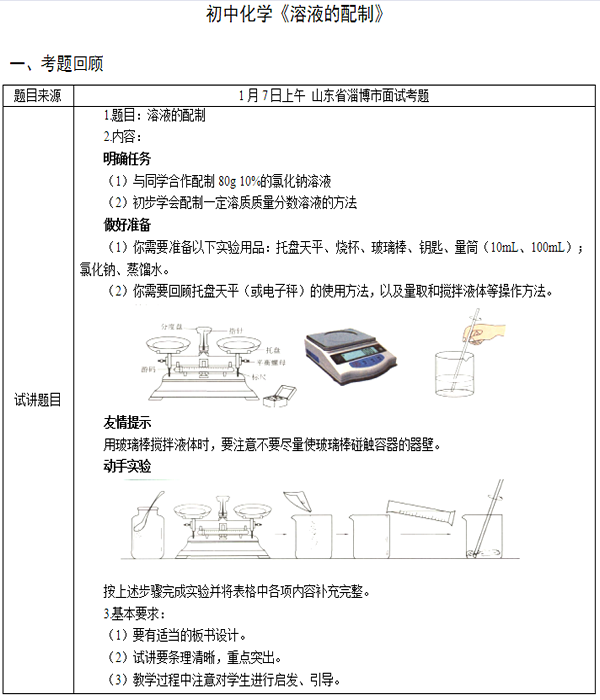 解析 【教学过程】 第一环节:谈话导入 【教师提问】上节课我们了解了溶液、溶质、溶剂等这些概念,老师这里有一杯盐水,谁能来给老师说一下盐水中的溶质、溶剂分别是什么? 【学生回答】盐水中,氯化钠是溶质,水是溶剂,盐水为溶液。 【教师总结】那如果老师告诉大家这杯盐水中氯化钠的质量分数是10%,总质量是80g的话,如何准确的配制这样一杯溶液呢? 第二环节:新课教学 1.实验前准备 【教师提问】如果想要配制一定质量分数的溶液,大家猜想一下,我们需要准备哪些实验用品以及实验器材呢? 【学生回答】需要托盘天平称取溶质的质量。 【学生回答】玻璃棒进行搅拌,烧杯进行盛装液体。 【学生回答】药品氯化钠、蒸馏水。 【教师总结】大家总结的都很好,需要准备的实验器材包括,托盘天平(或电子秤)、烧杯、玻璃棒、氯化钠以及蒸馏水,量筒、钥匙。 【教师提问】同学们,在使用之前,先回顾一下托盘天平的使用步骤。 【学生回答】(1)左物右砝(2)使用前调节平衡,调节游码、指针都归零(3)取用砝码用镊子(4)物品不能直接放在托盘上称量,需要放在纸上或者烧杯中(5)称量完毕将砝码放入盒内,将游码归零。 2.动手实验 【教师提问】在做实验之前我们应该做哪些准备? 【学生回答】需要先计算出所要称取的氯化钠的质量,也就是80g×10%=8g。 【教师引导】现在同学们可以以实验小组为单位,来设计一下配制80g 10%氯化钠溶液的流程及步骤。 【学生回答】(1)取氯化钠药品(计算);(2)称量;(3)溶解。 【教师引导】那同学们根据你们设计的实验方案开始动手做实验,在实验的过程中注意实验操作的规范性以及小组之间的合作分配。 【教师提问】同学们说一下在量取蒸馏水以及搅拌中注意的事项? 【学生回答】本次实验所需蒸馏水是72mL,先用100mL量筒量取70mL蒸馏水,其次再用10mL量取2mL蒸馏水,在量取中要注意将量筒放平,视线与刻度线保持水平;搅拌过程中要边加水边搅拌,而且搅拌时候尽量不要使玻璃棒触碰容器的器壁。 【教师总结】同学们在刚刚的实验中操作都很规范。在配制一定质量分数的溶液的实验中,第一步是计算溶质、溶剂的质量;第二步是称量药品;第三步是加水搅拌溶解。 环节三:巩固提高 【教师提问】 (1)称量时,药品和砝码放反了,但是没有使用游码,对结果的影响是什么? (2)玻璃棒的作用是什么? (3)在量取溶剂时,俯视量筒,造成结果偏大还是偏小? 环节四:小结作业 小结:学生总结本节课重点知识,教师补充。 作业:与同学间交流本次实验的经验和教训。 【板书设计】略