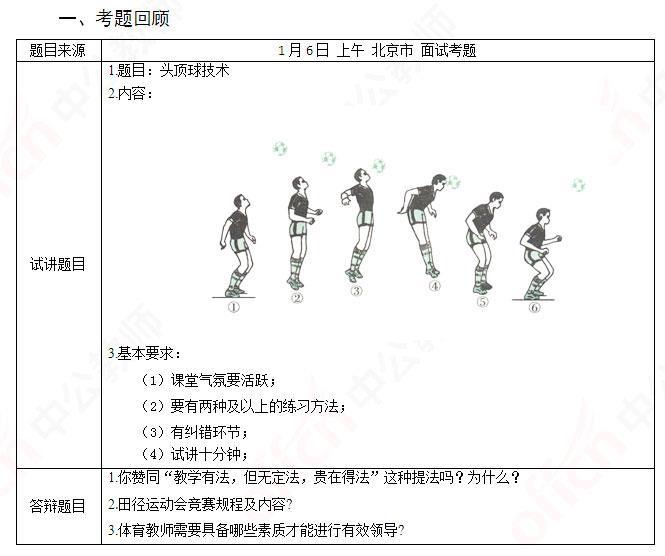 解析 【教学过程】 一、教学内容: 1.头顶球技术 2.颠球练习 二、教学目标: 【知识与技能目标】 激发学生对足球运动的兴趣,引导学生积极练习。 【过程与方法目标】 使学生基本掌握正面头顶球的技术并能够简单的与实战相结合。 【情感态度价值观目标】 增强学生的协调能力,培养学生团结协作、积极进取的意志品质。 三、教学重难点: 教学重点:头顶球的时机判断 教学难点:头顶球时的落点判断 四、教学过程: (一)开始部分(2分钟) 教学内容:1、准备器材;2、师生问好;3、宣布本次课内容;4、安排见习生。 教师指导: 1、老师提前到场与值日生准备场地与器材; 2、接受体委报告人数,向学生问好; 3、宣布本次课内容:复习传球,学习头顶球 4、妥善安排见习生。 学生活动: 1、值日生协助老师一起准备场地器材; 2、体委向老师报告人数,师生问好; 3、聆听本课内容,思考目标难易,树立安全意识; 4、见习生协助老师管理好器材。 组织:二列横队 要求:集合快静齐,队伍整齐统一,精神饱满,注意力集中。 (二)准备部分(10~15分钟) 教学内容: 1.复习足球基本功(复习行进间脚内侧传接球,同时结合一些基本控球动作。) 2.徒手操(1、头部运动2、扩胸运动3、体转运动4、腹背运动5、正压腿6、膝关节运动7、手腕踝关节运动) 3.颠球练习 教师活动:教师语言提示,难点示范,讲解、循环指导。 先由跑动中脚内侧传球开始,不固定方向,再做徒手操,最后做颠球练习。 重点强调传球时的观察能力 学生活动:服从老师指挥,听从老师口令,动作尽量规范,动作幅度要大,协调能力要强,特别注意安全 组织:半个足球场任意散开。两人一组。 要求:两人一组,间距不少于10米,注意来球方向和力量。 徒手操要紧跟节拍。 颠球时要尽量控制好球。 (三)基本部分(25~30分钟) 教学内容:学习正面头顶球 1.徒手做原地头顶球练习;2.原地自抛头顶球;3.同伴迎面抛球头顶球; 教师活动:1.通过老师讲解示范使学生充分了解头顶球技术; 2.强调头顶球时的触球部位及落点判断是头顶球技术的重点和难点。 3.提示发力部位,提醒学生避免闭眼、缩脖顶球; 4.引导和启发学生在实践中发现问题,师生共同解决。 学生活动:1.认真聆听教师讲解;仔细观看教师示范;注意动作关键环节;注意触球部位和触球时机;掌握上体摆动动作;体会如何发力;相互鼓励加油;相互提醒动作。 2.练习次数:每项练习次数在10~15次 要求:两人一组,抛球的时候要认真,不要为了顶上力量而导致动作变形。 (四)结束部分(5~10分钟) 教学内容:1.静拉放松练习;2.集合整队;总结情况;3.值日生还器材。 教师活动:通过语言提示引导学生放松。 使学生身心得到充分放松,心率逐渐降低,心理恢复平静。 学生活动:1.跟从老师口令引导伴随着音乐做静拉放松练习。 2.认真听讲,仔细总结。 组织:二列横队 五、场地器材: 1、足球12个;2、标志桶8个 六、负荷预计: 密度:50%~60% 强度:中等 七、课后反思: 【答辩题目解析】 1.你赞同“教学有法,但无定法,贵在得法”这种提法吗?为什么? 这一说法非常正确,我十分赞成。良好的教学方法,可以发挥教师的教学智慧,提升教育、教学质量。“教学有法”是指教学过程中有一定的规律可循,有着一定的教学方法;“但无定法”是指教学的方式和方法并不固定,而是灵活多变、富有个性的;“贵在得法”是教育教学的灵魂,它是教师将教学技巧、方法巧妙地应用于具体的教学情景中。将这三者有效合一,能让学生在学习中有所启迪,掌握学习的方法和要领,做到学有所得、学有所乐。 之所以赞成这种观点,是因为教师在授课前往往会根据以往授课经验设定一定的教学方案,也就是教学有法。但走进课堂后,教师面对的是一个个鲜活的学生,他们的课堂反应不同,对课堂内容的理解和掌握也不同,因此,我们事先设定教学的方法会受到教学内容的特点、学生知识水平和个性的差异、教师自身的素质与能力以及学校现有的客观条件等多方面的制约。因此,只有教师明察课堂,适时调控,灵活选择切实可行的方法,才能有良好的教学结果。 当然,要真正做到得法,达到良好的教学效果,就要求教师在教学的过程中从以下三个方面来提升教学能力:一是抓住教学规律,总结教学法;二是关注教学体验,教学科学化;三是围绕教学要点,授课多元化。教师要将间接经验与直接经验相结合,尤其是将教师在教学中的指导作用与学生在学习中的主体作用相结合,这是教学中最重要的教学方法和教学规律,才能让学生真正有所受益。 2.田径运动会竞赛规程及内容? (1)根据组织方案拟定运动会的名称、目的要求、比赛日期及地点,参加单位及组别。 (2)比赛项目。 (3)参加比赛办法。包括每单位可参加多少人,每人可报几项,每项可报几人及参加者的资格问题。 (4)报名办法。规定报名截止日期、报名条件及身体体检规定等。 (5)计分及奖励办法。说明各项录取的名额,单项、集体项目、全能和破纪录、团体总分的计算与奖励办法等。 (6)比赛规则。 (7)参加单位应注意事项及各队报到日期等内容。 3.体育教师需要具备哪些素质才能进行有效领导? (1)高尚的思想品德。 ①具有较高的思想政治觉悟。 ②具有牢固的专业思想。 ③要具有良好的心理品质。 (2)具有广博的知识。 (3)要有良好的业务能力。 (4)体育教师还要具备健壮的体魄。