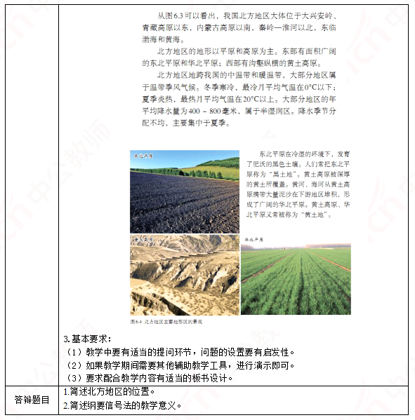 问题 初中地理《黑土地与黄土地》 一、考题回顾 二、考题解析 【教学过程】 (一)导入新课 设置情境,通过展示具有北方特色的冰雕和雾凇景观图,引出哈尔滨和吉林位于我国北方,并提问:北方地区都有哪些地理特征呢?引发学生思考导入新课。 (二)新课教学 1.北方地区的位置、范围 【自主学习】读北方地区的地形图,回答以下问题: (1)北方地区位于哪里?请同学们结合北方地区的地形图,找出北方地区的边界。 (2)北方地区濒临什么海? (3)渤海、黄海于位北方地区的什么方位? 【学生读图回答】 (1)北方地区的边界为大兴安岭、青藏高原、内蒙古高原以及秦岭—淮河以北。 (2)北方地区临近渤海和黄海。 (3)渤海、黄海于位北方地区的东方。 【教师总结】北方地区大体位于大兴安岭、青藏高原以东,内蒙古高原以南,秦岭—淮河以北,东临渤海和黄海。 2.北方地区的地形 【问题】北方地区都有哪些地形?位于北方地区什么方位? 【学生回答】平原、高原;平原位于东部,高原位于西部。 【教师总结】北方地区的地形以平原和高原为主。东部有面积广阔的东北平原和华北平原;西部有沟壑纵横的黄土高原。 3.北方地区的气候 【展示】齐齐哈尔、石家庄和延安三个地区的气候图,思考问题。 (1)齐齐哈尔、石家庄和延安三个城市的气候都有什么共同特征? (2)石家庄和齐齐哈尔的气候有什么差异?主要原因是什么? (3)石家庄和延安的气候有什么差异?主要原因是什么? 【学生观察回答】 (1)齐齐哈尔、石家庄和延安三个城市气候的共同特征:都是温带季风气候,最冷月气温都在0℃以下,最热月气温都在20℃以上。 (2)齐齐哈尔、石家庄气候差异主要是气温差异,影响因素是纬度位置。 (3)石家庄和延安的气候差异主要是降水差异,影响因素是海陆位置。 【活动】学生讨论,结合降水、温度带分布图,找出北方地区温度、降水的特点。 【学生回答】夏季高温多雨,冬季寒冷干燥。 【教师总结】 北方地区地跨我国的中温带和暖温带,大部分地区属于温带季风气候。冬季寒冷,最冷月气温在0℃以下;夏季,最热月平均气温在20℃以上。大部分地区的年平均降水量为400-800毫米,属于半湿润气候区。降水季节分布不均,主要集中于夏季。 4.北方地区的土壤 结合北方地区的主要地形区的景观图,说说不同地形区的土壤有什么特点。 【教师总结】东北平原在冷湿的环境下,发育了肥沃的黑色土壤。人们常把东北平原称为“黑土地”。黄土高原被深厚的黄土所覆盖。黄河、海河从黄土高原携带大量的泥沙在下游地区堆积,形成了广阔的华北平原。黄土高原、华北平原又被称为“黄土地”。 (三)小结作业 小结:请学生来说说这节课的收获。 作业:课后查阅资料思考北方地区的自然环境对农业的影响。 【板书设计】 【答辩题目解析】 1.简述北方地区的位置。 2.简述纲要信号法的教学意义。