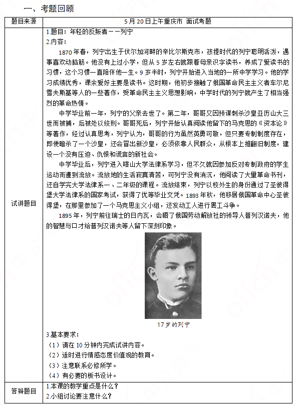 问题 高中历史《年轻的反叛者——列宁》 二、考题解析 【教学过程】 环节一:导入新课 教师播放视频《列宁的葬礼》,提出问题:1924年1月21,数万的工人、农民、士兵在最寒冷的冬季排着长队来送别列宁,为列宁的去世感到无限悲哀。提问:列宁究竟是怎样一个人?他为俄国社会的发展做出了怎样的贡献。引起学生思考,从而导入新课。 环节二:新课讲授 (一)列宁民主革命思想的确立 教师引导学生复习十月革命相关知识点,学习列宁思想产生的主要社会背景:俄国沙皇统治腐败,经济发展缓慢,百姓生活困苦,国内矛盾异常尖锐突出,民主革命思想兴起。 教师接着播放列宁纪录片相关视频,提出问题:列宁民主革命思想是怎么产生的?学生根据视频及课本可知产生原因如下: (1)中学时代列宁阅读车尔尼雪夫斯基等人的著作,受民主革命思想影响。 (2)哥哥革命悲剧的影响。 (3)马克思主义思想的影响。 教师接着出示相关资料,提出问题:中学时代的列宁由于民主革命思想的影响,产生了强烈的革命热情,但这只是一种萌芽状态,其思想是怎么由感性上升到理性的?其理性主张又是什么呢? 学生根据课本及所给资料回答:列宁哥哥因刺杀沙皇未果被处死刑,对列宁产生巨大震动,他开始阅读《资本论》等著作,使自己的革命思想由感性上升到理性。他主张必须依靠人民群众,从根本上推翻旧制度,建设新社会。 (二)列宁早期革命活动 过渡:列宁哥哥革命的悲剧促进了列宁革命思想的发展,而这一思想又推动了列宁早期的革命活动。我们来看看,它又是如何推动的呢? 教师播放相关视频,让学生根据视频及教材概括列宁的早期革命活动,之后教师总结归纳: (1)参加反对沙皇专制政府的学生运动; (2)1893年,参加马克思主义小组,发动工人罢工; (3)1895年会晤劳动解放社领导人普列汉若夫。 教师接着讲述:伟大的革命者源于伟大的信仰,伟大的信仰造就了伟人风范。列宁勇于探索的革命生涯都源于中学时代革命信念的确立,而这一信念又推动着列宁不断对马克思主义进行发展和创新。 教师提问:我们能从列宁身上学到什么精神?学生自由发言,教师总结:树立为国家、民族的发展振兴而学习、工作的人生理想。 环节三:小结作业 1.小结:师生共同总结回顾本课所学知识。 2.作业:课下搜集列宁的相关故事,下节课分享。 【答辩题目解析】 1.本课的教学重点是什么? 2.小组讨论要注意什么?