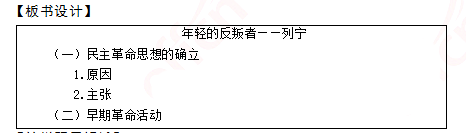 解析 1、本课的教学重点是列宁民主革命思想产生的原因及列宁的早期活动。因为这两个知识点比较简单,教师可以通过让学生观看视频、阅读教材的方式自行归纳总结。其中民主革命思想产生的原因需要注意的是让学生了解列宁民主革命思想的发展过程,故本课教学过程中对列宁思想从感性上升到理性进行了着重讲解。 2、(1)因材施“论”:在课堂上让学生讨论的问题应该是学生感到似懂非懂的问题,课堂讨论的问题一次不宜太多,讨论的时间也不能太长且难易适中。 (2)组内异质,组间同质:分组时,可以给本班学生按成绩、语言表达能力、性格、组织能力等方面排个队,然后再进行优化组合,并从中挑选一位性格较为开朗、组织能力较强的学生作为该组的组长,在实施讨论时给本组分配角色,组织讨论,做好讨论记录。 (3)组织性:教师在课堂中应深入每一个活动小组,引导他们的讨论,让每个学生都有话说,树立他们的自信心和自尊心。给组内每位成员落实相应的任务和要求。在讨论前除了有明确的分工外,还必须落实相应的讨论要求。