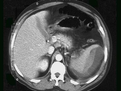 男,54岁,外伤后十余天,左季肋区疼痛、肿胀。CT检查如图,最佳的诊断是 ( )A、脾梗死B、脾扭转C、脾包膜下血肿D、脾挫裂伤E、脾...