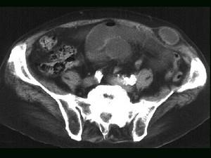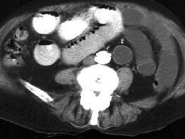 女,60岁,反复左下腹隐痛约20年,伴包块外突2年余,站立或增加腹压后有一包块外凸,质地较软,平卧时消失且腹痛缓减,CT检查如图,最可能的诊断是 ( ) ...