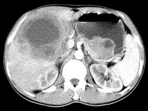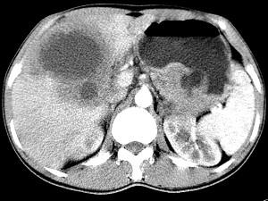 女,61岁,上腹部疼痛一个月,食欲减退,消瘦,CT所见如图,最可能的诊断是 ( )A、肝包虫病B、原发性肝癌C、肝转移瘤D、胃...