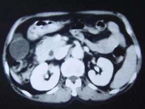问题 男,55岁,中上腹隐痛多年,剑突下压痛,影像检查如图,最可能的诊断是 ( )