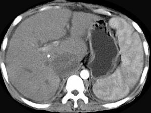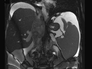 问题 女性,26岁,腹胀不适7月,腹软,肝右肋缘下1cm,影像检查如图,可能的诊断为 ( )